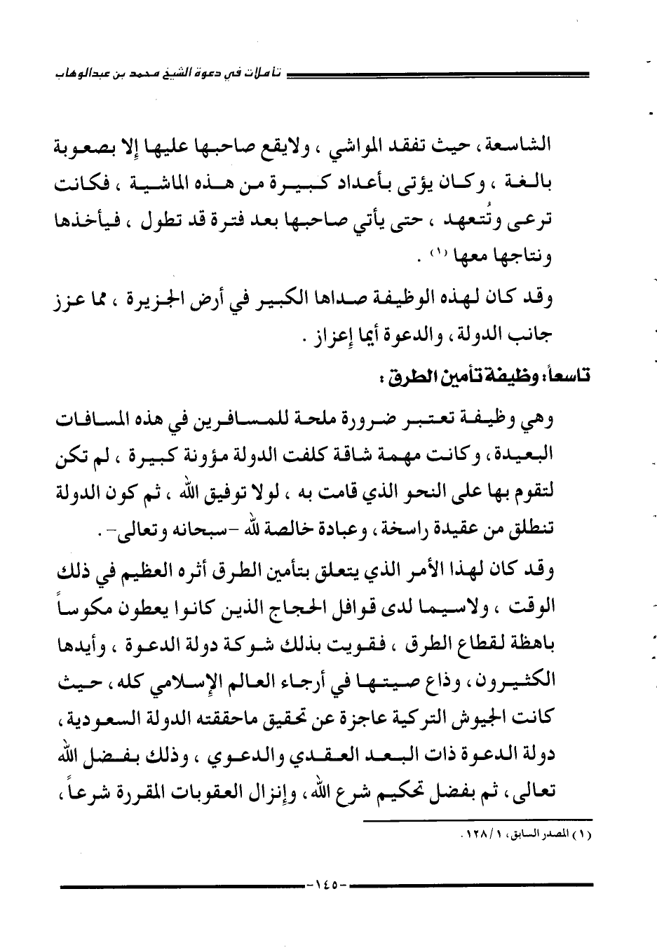 وقد كان لهذا الأمر الذي يتعلق بتأمين الطرق أثره العظيم في ذلك الوقت، ولا سيما لدى قوافل الحجاج الذين كانوا يعطون مكوساً باهظة لقطاع الطرق، فقويت بذلك شوكة دولة الدعوة، وأيدها الكثيرون، وذاع صيتها في أرجاء العالم الإِسلامي كله، حيث كانت الجيوش التركية عاجزة عن تحقيق ما حققته الدولة السعودية، دولة الدعوة ذات البعد العقدي والدعوي، وذلك بفضل الله تعالى، ثم بفضل تحكيم شرع الله، وإِنزال العقوبات المقررة شرعاً،