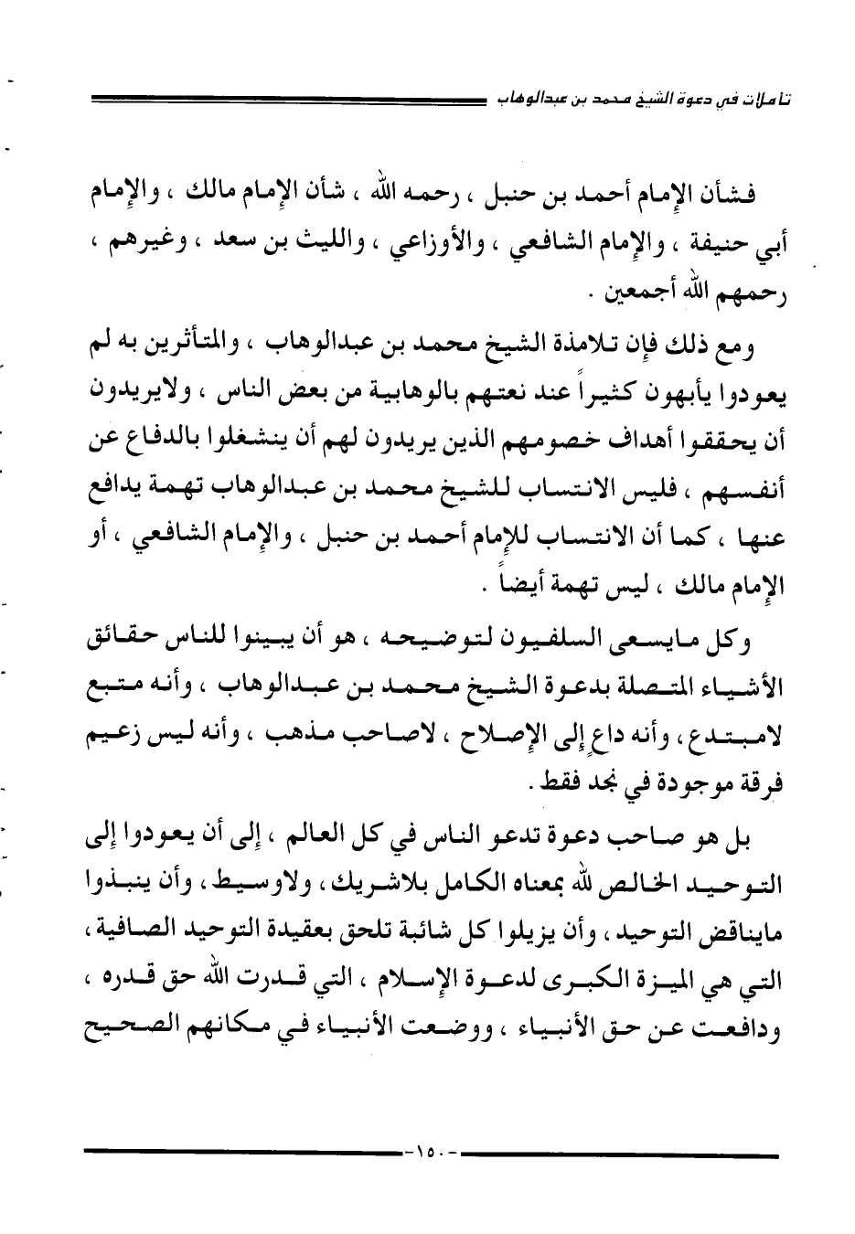 وكل ما يسعى السلفيون لتوضيحه، هو أن يبينوا للناس حقائق الأشياء المتصلة بدعوة الشيخ محمد بن عبد الوهاب، وأنه متبع لا مبتدع، وأنه داعٍ إِلى الإِصلاح، لا صاحب مذهب، وأنه ليس زعيم فرقة موجودة في نجد فقط.