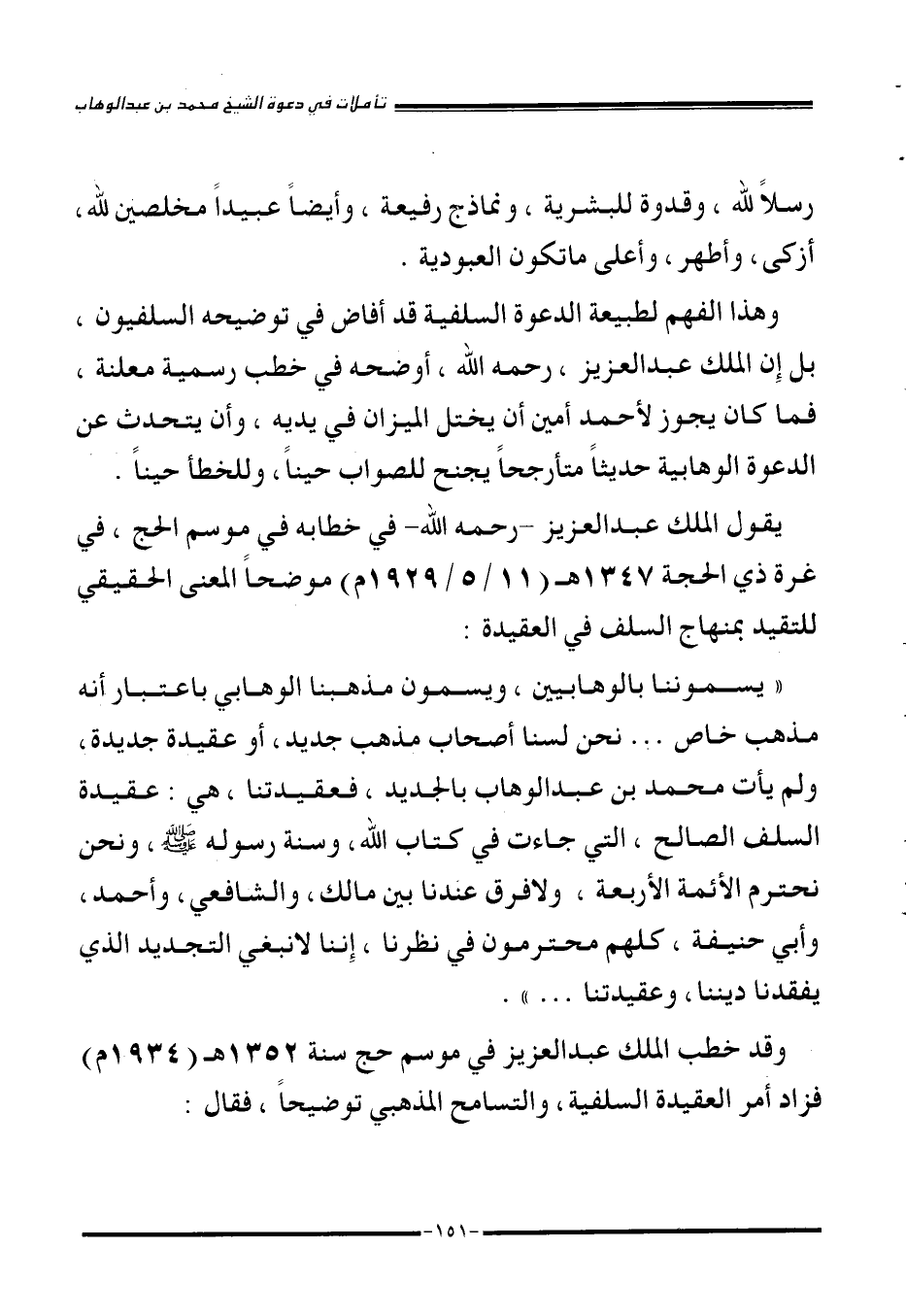 وقد خطب الملك عبد العزيز في موسم حج سنة 1352هـ (1934م) فزاد أمر العقيدة السلفية، والتسامح المذهبي توضيحا، فقال: