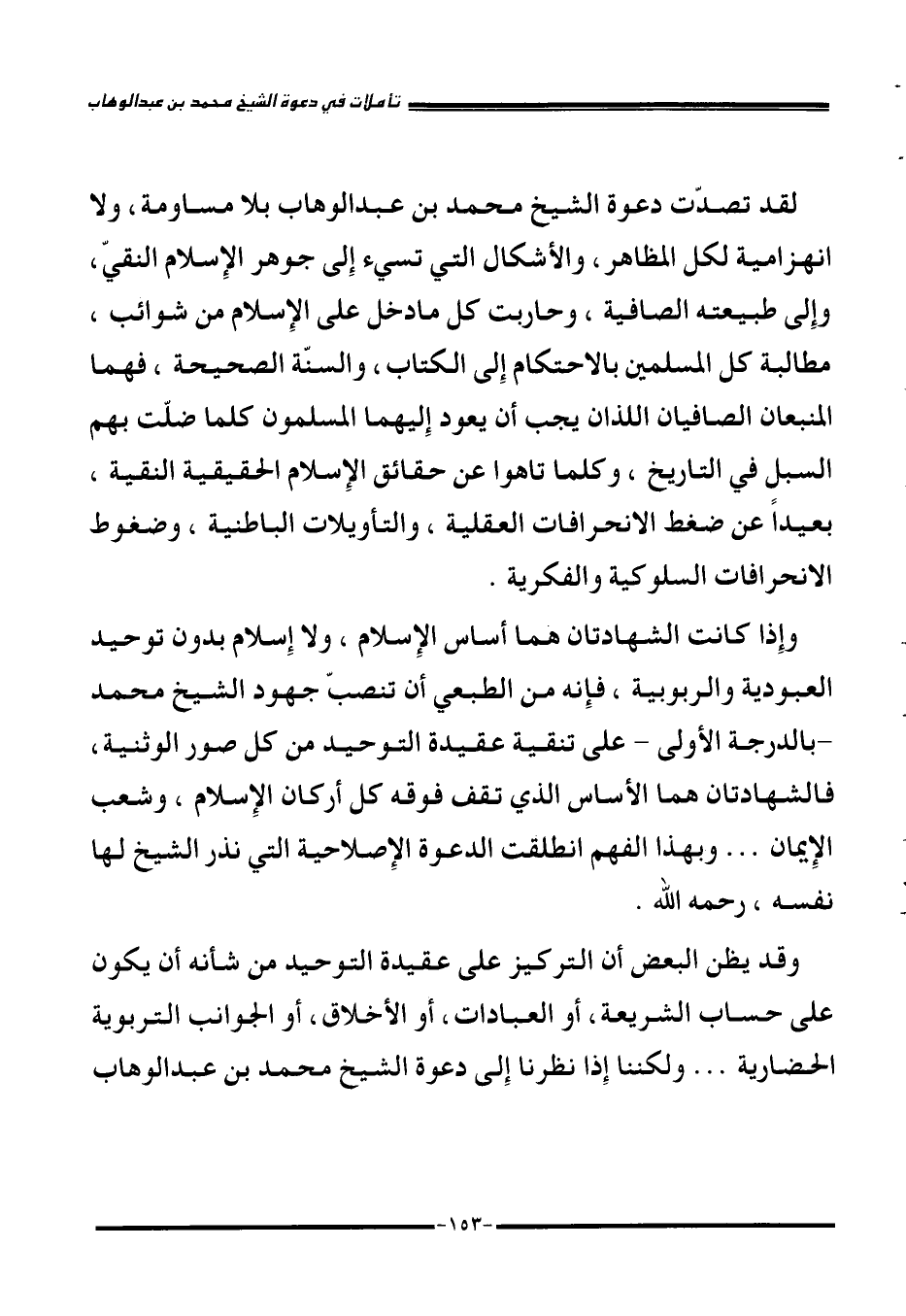وإِذا كانت الشهادتان هما أساس الإِسلام، ولا إِسلام بدون توحيد العبودية والربوبية، فإِنه من الطبيعي أن تنصبّ جهود الشيخ محمد -بالدرجة الأولى- على تنقية عقيدة التوحيد من كل صور الوثنية، فالشهادتان هما الأساس الذي تقف فوقه كل أركان الإِسلام، وشعب الإِيمان وبهذا الفهم انطلقت الدعوة الإصلاحية التي نذر الشيخ لها نفسه، رحمه الله.