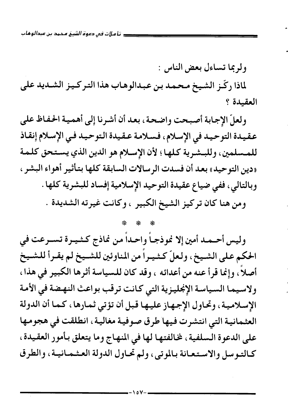 ولربما تساءل بعض الناس: لماذا ركّز الشيخ محمد بن عبد الوهاب هذا التركيز الشديد على العقيدة؟