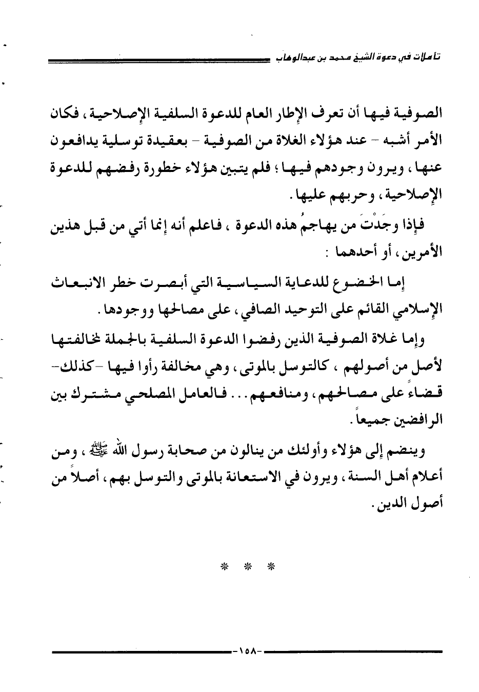 الصوفية فيها أن تعرف الإِطار العام للدعوة السلفية الإِصلاحية، فكان الأمر أشبه -عند هؤلاء الغلاة من الصوفية- بعقيدة توسلية يدافعون عنها، ويرون وجودهم فيها، فلم يتبين هؤلاء خطورة رفضهم للدعوة الإِصلاحية، وحربهم عليها. فإِذا وجَدْتَ من يهاجمُ هذه الدعوة، فاعلم أنه إِنما أتي من قبل هذين الأمرين، أو أحدهما: