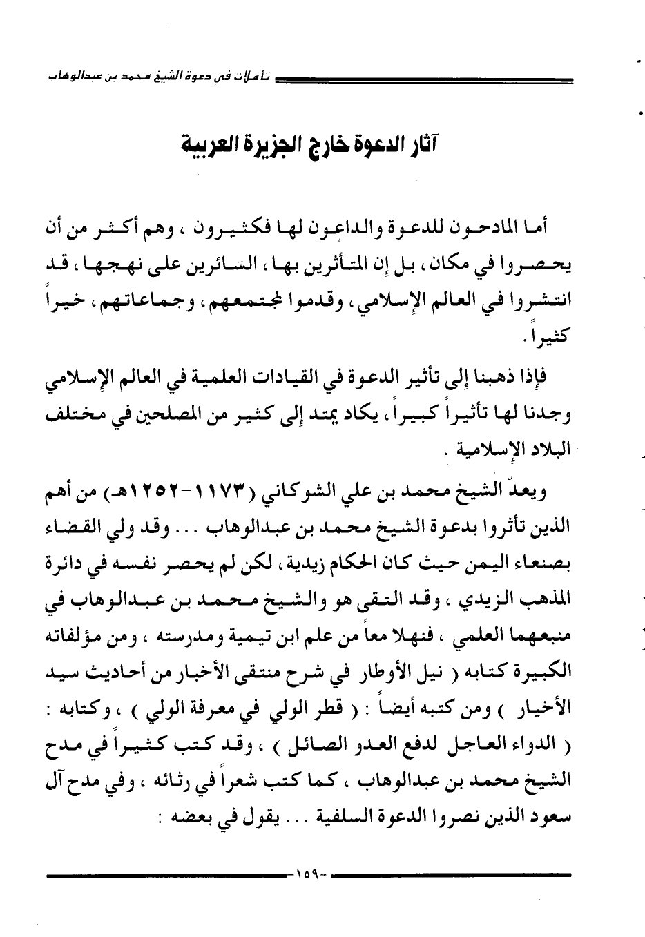 ويعدّ الشيخ محمد بن علي الشوكاني (1173- 1252هـ) من أهم الذين تأثروا بدعوة الشيخ محمد بن عبد الوهاب وقد ولي القضاء بصنعاء اليمن حيث كان الحكام زيدية، لكن لم يحصر نفسه في دائرة المذهب الزيدي، وقد التقىِ هو والشيخ محمد بن عبد الوهاب في منبعهما العلمي، فنهلا معا من علم ابن تيمية ومدرسته، ومن مؤلفاته الكبيرة كتابه (نيل الأوطار في شرح منتقى الأخبار من أحاديث سيد الأخيار) ومن كتبه أيضا: (قطر الولي في معرفة الولي) ، وكتابه: (الدواء العاجل لدفع العدو الصائل) ، وقد كتب كثيرا في مدح الشيخ محمد بن عبد الوهاب، كما كتب شعرا في رثائه، وفي مدح آل سعود الذين نصروا الدعوة السلفية يقول في بعضه: