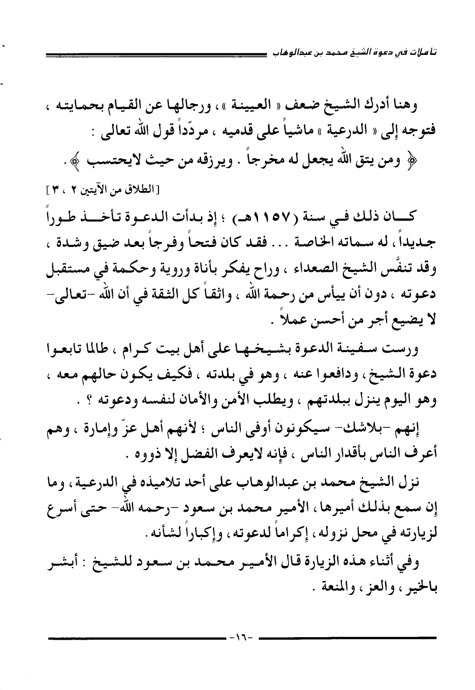 وهنا أدرك الشيخ ضعف (العيينة) ، ورجالِها عن القيام بحمايته، فتوجه إِلى "الدرعية" ماشيا على قدميه، مردّداَ قول الله تعالى: {وَمَنْ يَتَّقِ اللَّهَ يَجْعَلْ لَهُ مَخْرَجاً وَيَرْزُقْهُ مِنْ حَيْثُ لا يَحْتَسِبُ} [الطّلاق من الآيتين: 2-3] .