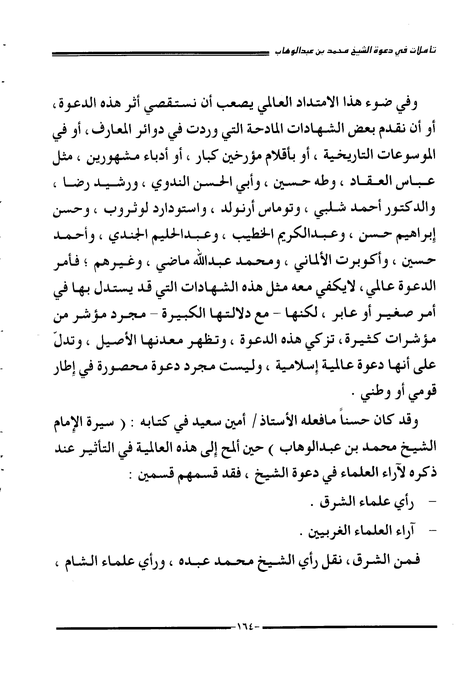 وقد كان حسنا ما فعله الأستاذ/ أمين سعيد في كتابه: (سيرة الإِمام الشيخ محمد بن عبد الوهاب) حين ألمح إِلى هذه العالمية في التأثير عند ذكره لآراء العلماء في دعوة الشيخ، فقد قسمهم قسمين: