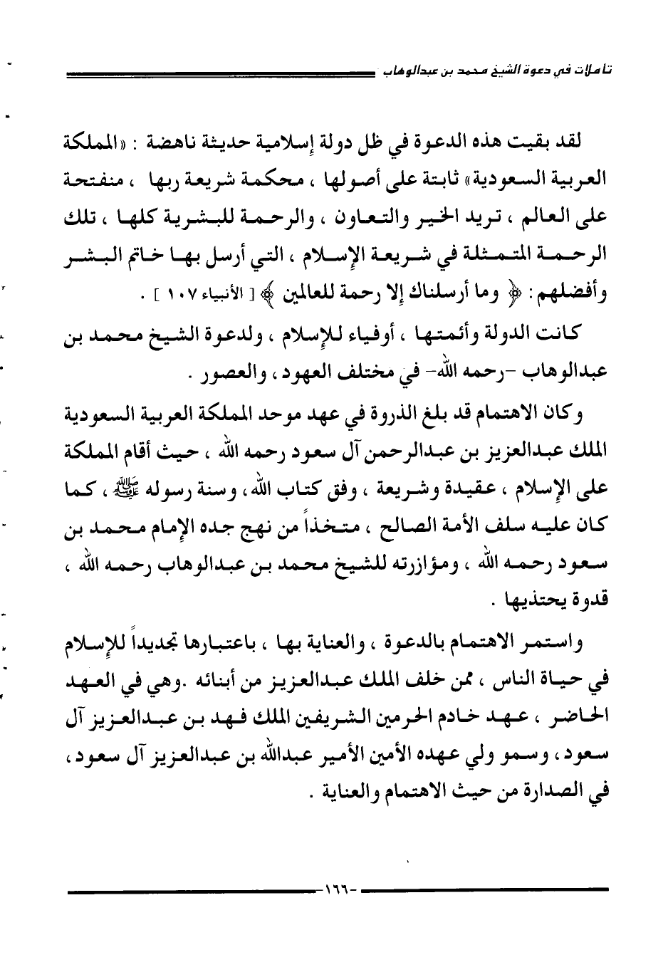 لقد بقيت هذه الدعوة في ظل دولة إِسلامية حديثة ناهضة: (المملكة العربية السعودية) ثابتة على أصولها، محكمة شريعة ربها، منفتحة على العالم، تريد الخير والتعاون، والرحمة للبشرية كلها، تلك الرحمة المتمثلة في شريعة الإِسلام، التي أرسل بها خاتم البشر وأفضلهم: {وَمَا أَرْسَلْنَاكَ إِلاَّ رَحْمَةً لِلْعَالَمِينَ} [الأنبياء: 107] .