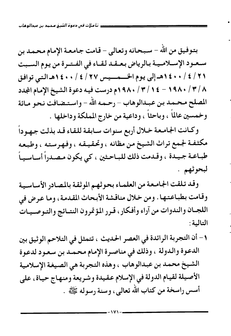 بتوفيق من الله -سبحانه وتعالى- قامت جامعة الإِمام محمد بن سعود الإِسلامية بالرياض بعقد لقاء في الفترة من يوم السبت 21/ 4/ 1400 هـ إِلى يوم الخميس 27/ 4/ 1400هـ التي توافق 8/ 3/ 1980- 14/ 3/ 1980م درست فيه دعوة الشيخ الإِمام المجدد المصلح محمد بن عبد الوهاب -رحمه الله- واستضافت نحو مائة وخمسين.