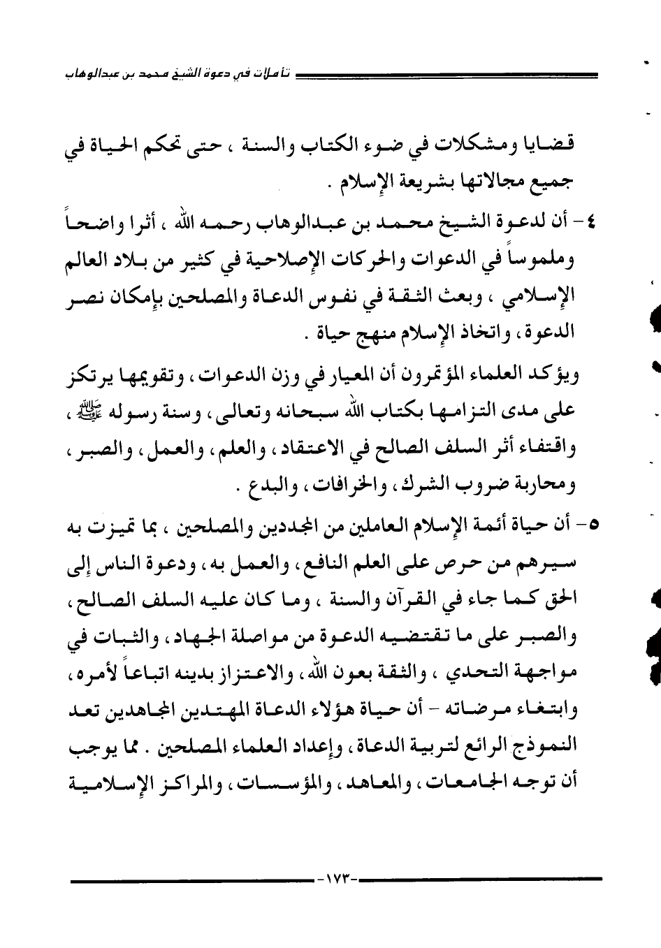 5- أن حياة أئمة الإِسلام العاملين من المجددين والمصلحين، بما تميزت به سيرهم من حرص على العلم النافع، والعمل به، ودعوة الناس إِلى الحق كما جاء في القرآن والسنة، وما كان عليه السلف الصالح، والصبر على ما تقضيه الدعوة من مواصلة الجهاد، والثبات في مواجهة التحدي، والثقة بعون الله، والاعتزاز بدينه اتباعا لأمره، وابتغاء مرضاته- أن حياة هؤلاء الدعاة المهتدين المجاهدين تعد النموذج الرائع لتربية الدعاة، وإِعداد العلماء المصلحين. مما يوجب أن توجه الجامعات، والمعاهد، والمؤسسات، والمراكز الإِسلامية
