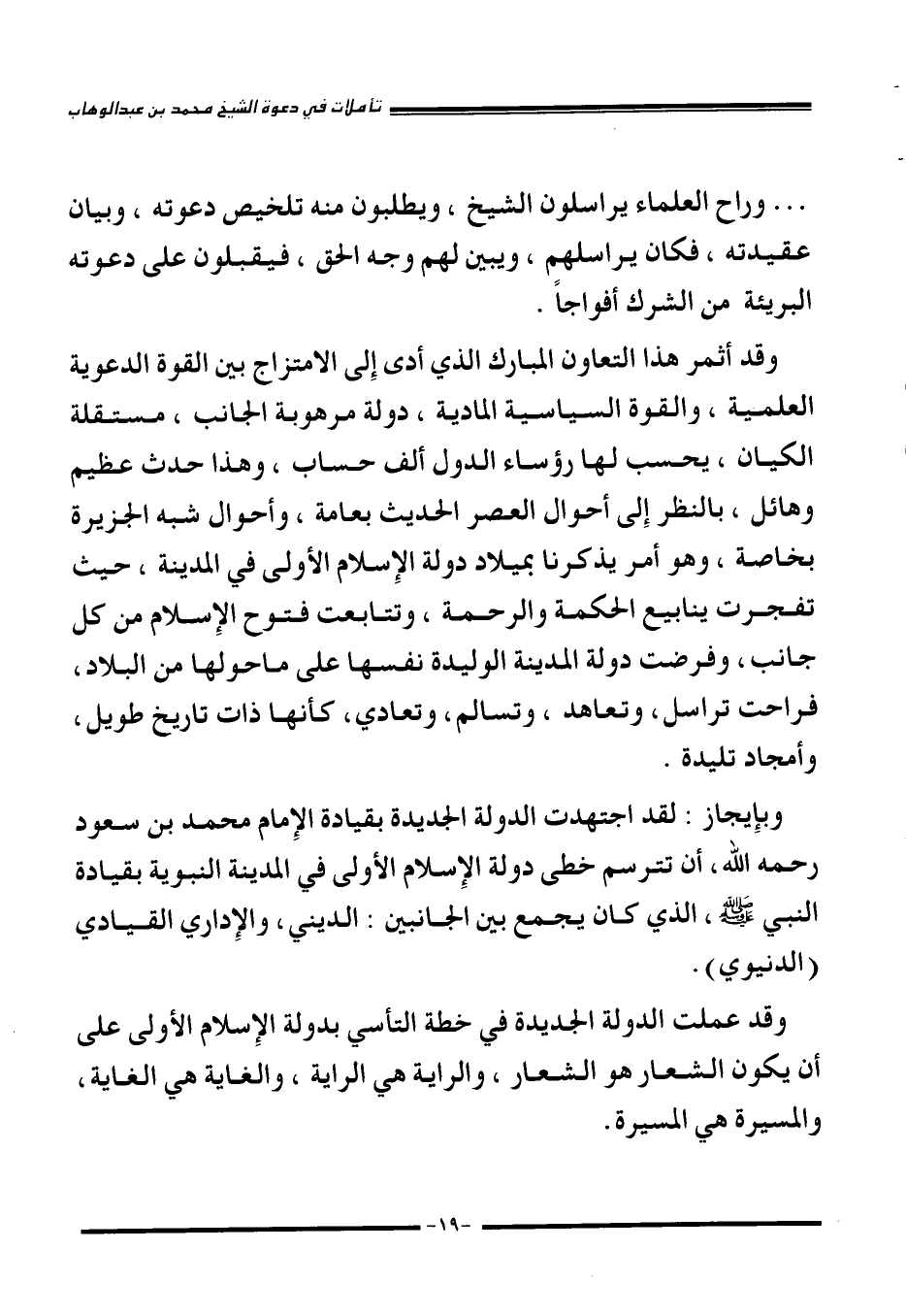 وبإِيجاز: لقد اجتهدت الدولة الجديدة بقيادة الإِمام محمد بن سعود رحمه الله، أن تترسم خطى دولة الإِسلام الأولى في المدينة النبوية بقيادة النبي ـ صلّى الله عليه وسلّم ـ الذي كان يجمع بين الجانبين: الديني، والإِداري القيادي (الدنيوي) . وقد عملت الدولة الجديدة في خطة التأسي بدولة الإِسلام الأولى على أن يكون الشعار هو الشعار، والراية هي الراية، والغاية هي الغاية، والمسيرة هي المسيرة.
