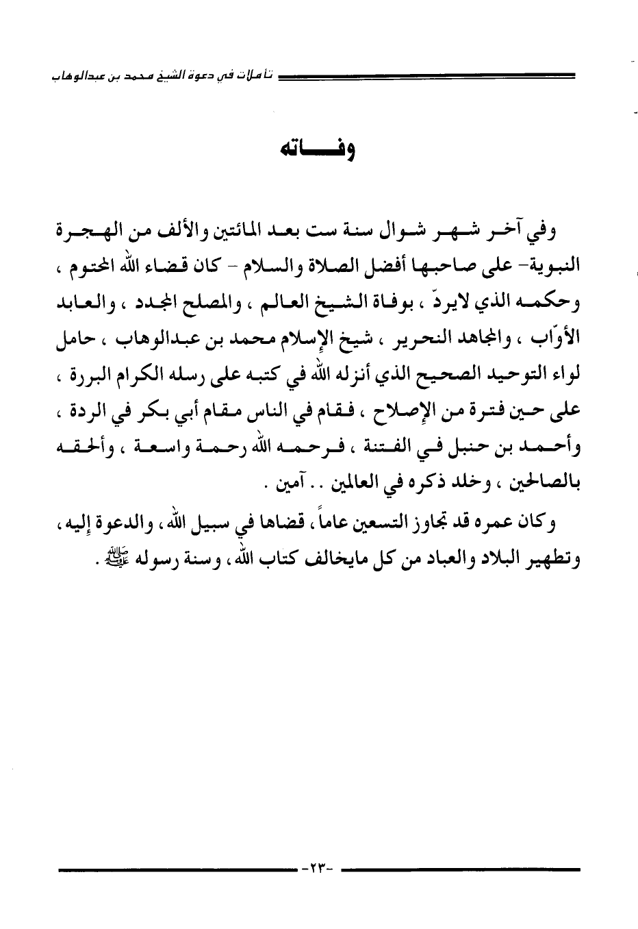 وفي آخر شهر شوال سنة ست بعد المائتين والألف من الهجرة النبوية -على صاحبها أفضل الصلاة والسلام- كان قضاء الله المحتوم، وحكمه الذي لا يرد، بوفاة الشيخ العالم، والمصلح المجدد، والعابد الأواب، والمجاهد النحرير، شيخ الإِسلام محمد ابن عبد الوهاب، حامل لواء التوحيد الصحيح الذي أنزله الله في كتبه على رسله الكرام البررة، على حين فترة من الإِصلاح، فقام في الناس مقام أبي بكر في الردة، وأحمد بن حنبل في الفتنة، فرحمه الله رحمة واسعة، وألحقه بالصالحين، وخلد ذكره في العالمين آمين.