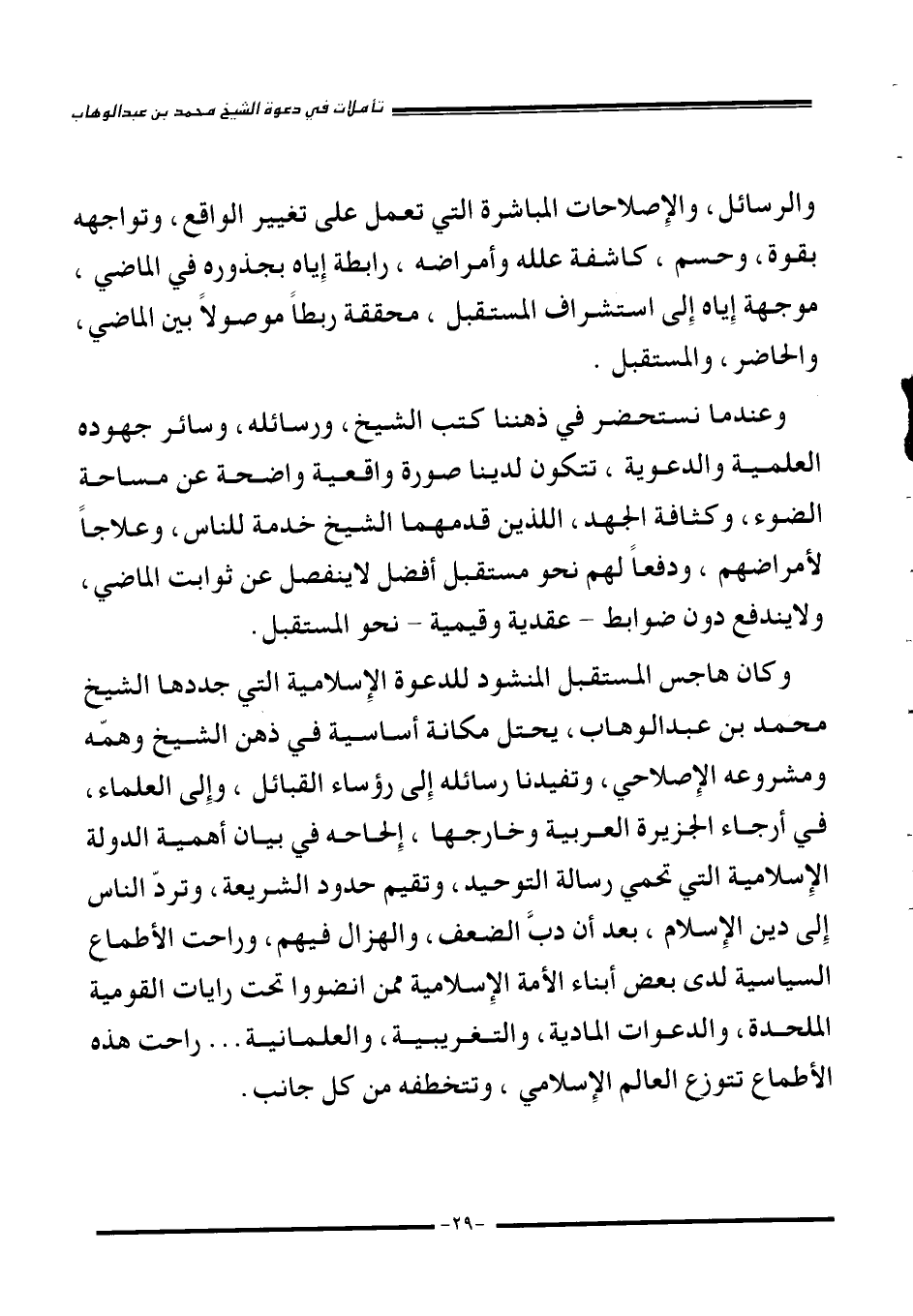 وكان هاجس المستقبل المنشود للدعوة الإِسلامية التي جددها الشيخ محمد بن عبد الوهاب، يحتل مكانة أساسية في ذهن الشيخ وهمه ومشروعه الإِصلاحي، وتفيدنا رسائله إِلى رؤساء القبائل، وإِلى العلماء، في أرجاء الجزيرة العربية وخارجها، إِلحاحه في بيان أهمية الدولة الإِسلامية التي تحمي رسالة التوحيد، وتقيم حدود الشريعة، وتردّ الناس إِلى دين الإِسلام، بعد أن دب الضعف، والهزال فيهم، وراحت الأطماع السياسية لدى بعض أبناء الأمة الإِسلامية ممن انضووا تحت رايات القومية الملحدة، والدعوات المادية، والتغريبية، والعلمانية راحت هذه الأطماع تتوزع العالم الإِسلامي، وتتخطفه من كل جانب.