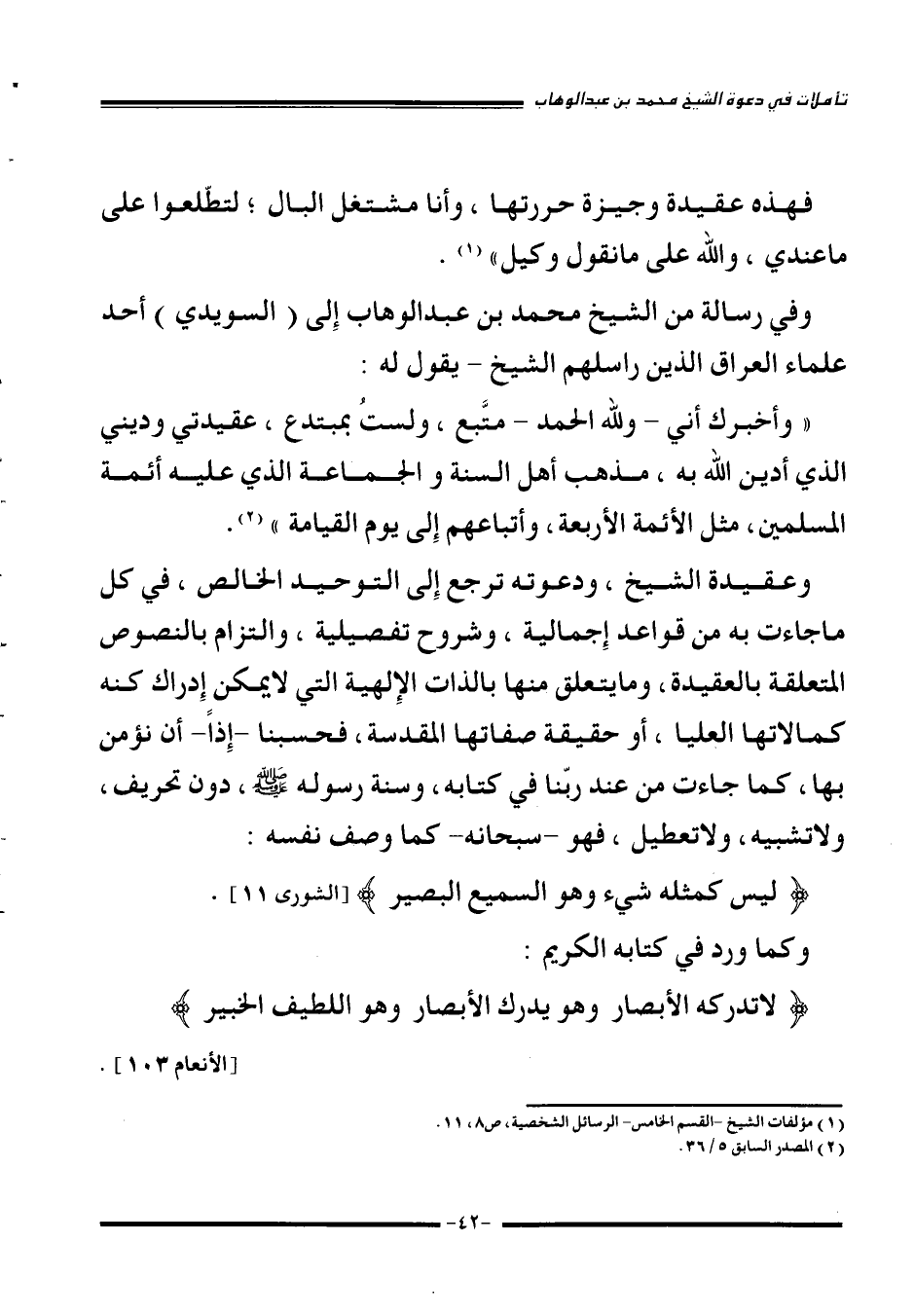 وفي رسالة من الشيخ محمد بن عبد الوهاب إِلى (السويدي) أحد علماء العراق الذين راسلهم الشيخ - يقول له: