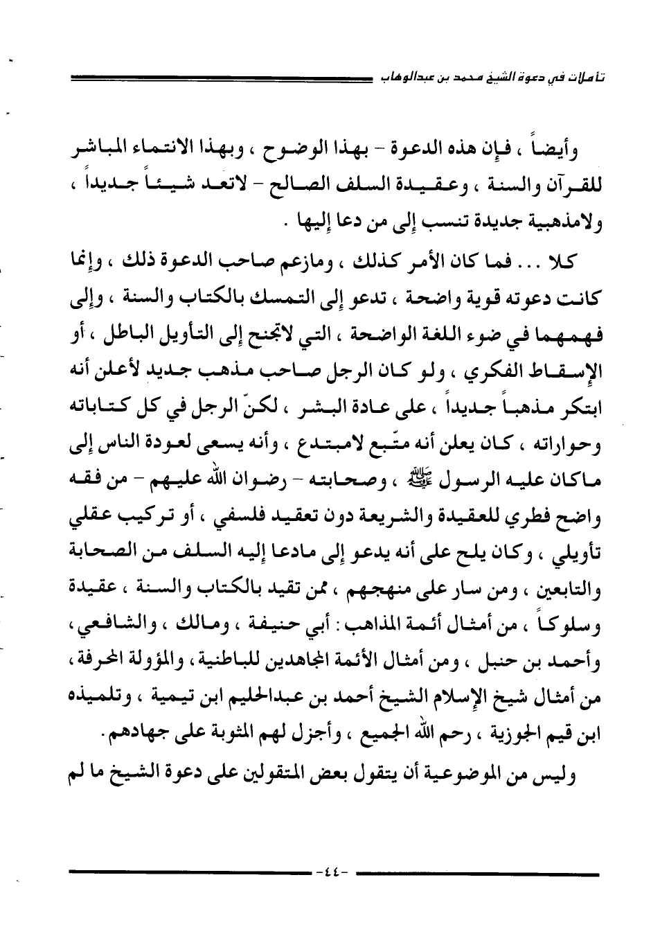 كلا فما كان الأمر كذلك، وما زعم صاحب الدعوة ذلك، وإِنما كانت دعوته قوية واضحة، تدعو إِلى التمسك بالكتاب والسنة، وإِلى فهمهما في ضوء اللغة الواضحة، التي لا تجنح إِلى التأويل الباطل، أو الإِسقاط الفكري، ولو كان الرجل صاحب مذهب جديد لأعلن أنه ابتكر مذهبا جديدا، على عادة البشر، لكنّ الرجل في كل كتاباته وحواراته، كان يعلن أنه متبع لا مبتدع، وأنه يسعى لعودة الناس إِلى ما كان عليه الرسول ـ صلّى الله عليه وسلّم ـ وصاحبته -رضوان الله عليهم- من فقه واضح فطري للعقيدة والشريعة دون تعقيد فلسفي، أو تركيب عقلي تأويلي، وكان يلح على أنه يدعو إِلى ما دعا إِليه السلف من الصحابه والتابعين، ومن سار على منهجهم، ممن تقيد بالكتاب والسنة، عقيدة وسلوكا، من أمثال أئمة المذاهب: أبي حنيفة، ومالك، والشافعي، وأحمد بن حنبل، ومن أمثال الأئمة المجاهدين للباطنية، والمؤولة المحرفة، من أمثال شيخ الإِسلام الشيخ أحمد بن عبد الحليم بن تيمية، وتلميذه ابن قيم الجوزية، رحم الله الجميع، وأجزل لهم المثوبة على جهادهم.