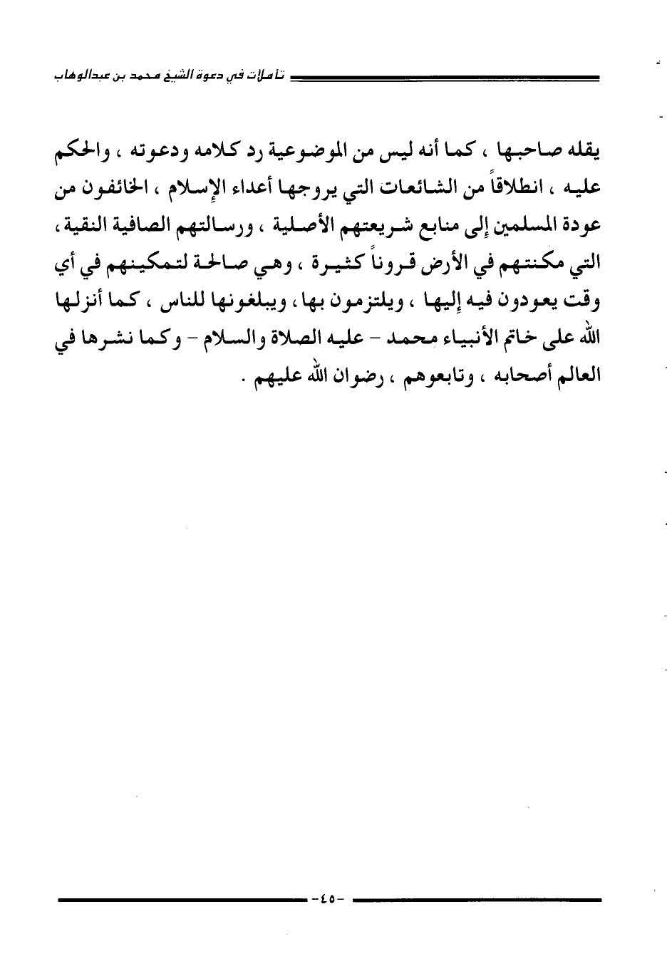 يقله صاحبها، كما أنه ليس من الموضوعية رد كلامه ودعوته، والحكم عليه، انطلاقا من الشائعات التي يروجها أعداء الإِسلام، الخائفون من عودة المسلمين إِلى منابع شريعتهم الأصلية، ورسالتهم الصافية النقية، التي مكنتهم في الأرض قرونا كثيرة، وهي صالحة لتمكينهم في أي وقت يعودون فيه إِليها، ويلتزمون بها، ويبلغونها للناس، كما أنزلها الله على خاتم الأنبياء محمد -عليه الصلاة والسلام- وكما نشرها في العالم أصحابه، وتابعوهم، رضوان الله عليهم.