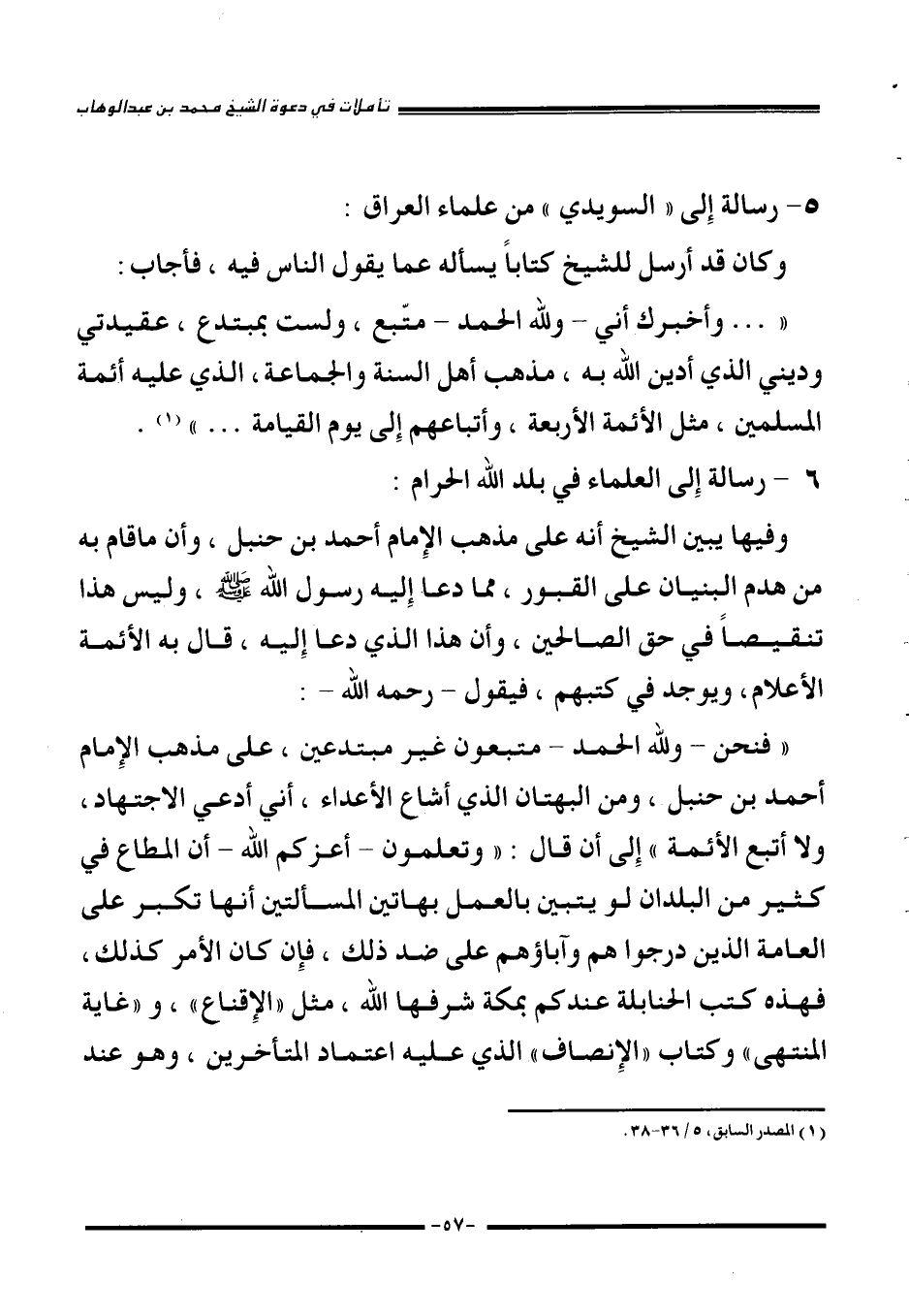 ((فنحن -ولله الحمد- متبعون غير مبتدعين، على مذهب الإِمام أحمد بن حنبل، ومن البهتان الذي أشاع الأعداء، أني أدعي الاجتهاد، ولا أتبع الأئمة)) ، إِلى أن قال: ((وتعلمون -أعزكم الله- أن المطاع في كثير من البلدان لو يتبين بالعمل بهاتين المسألتين أنها تكبر على العامة الذين درجوا هم وآباؤهم على ضد ذلك، فِإن كان الأمر كذلك، فهذه كتب الحنابلة عندكم بمكة شرفها الله، مثل (الإِقناع) ، و (غاية المنتهى) وكتاب (الإِنصاف) الذي عليه اعتماد المتأخرين، وهو عند