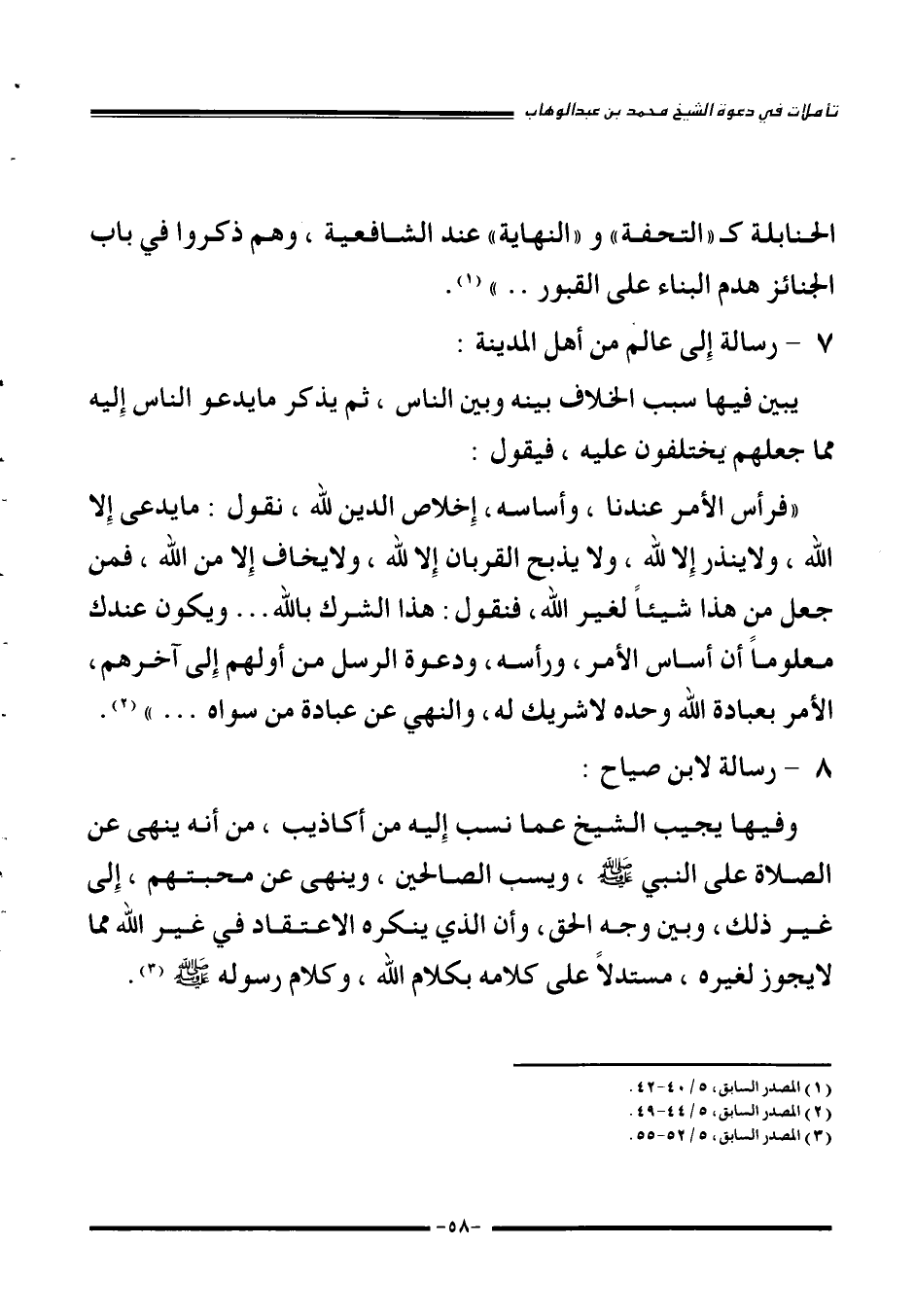 وفيها يبين الشيخ أنه على مذهب الإِمام أحمد بن حنبل، وأن ما قام به من هدم البنيان على القبور، مما دعا إِليه رسول الله ـ صلّى الله عليه وسلّم ـ وليس هذا تنقيصا في حق الصالحين، وأن هذا الذي دعا إِليه، قال به الأئمة الأعلام، ويوجد في كتبهم، فيقول -رحمه الله-: