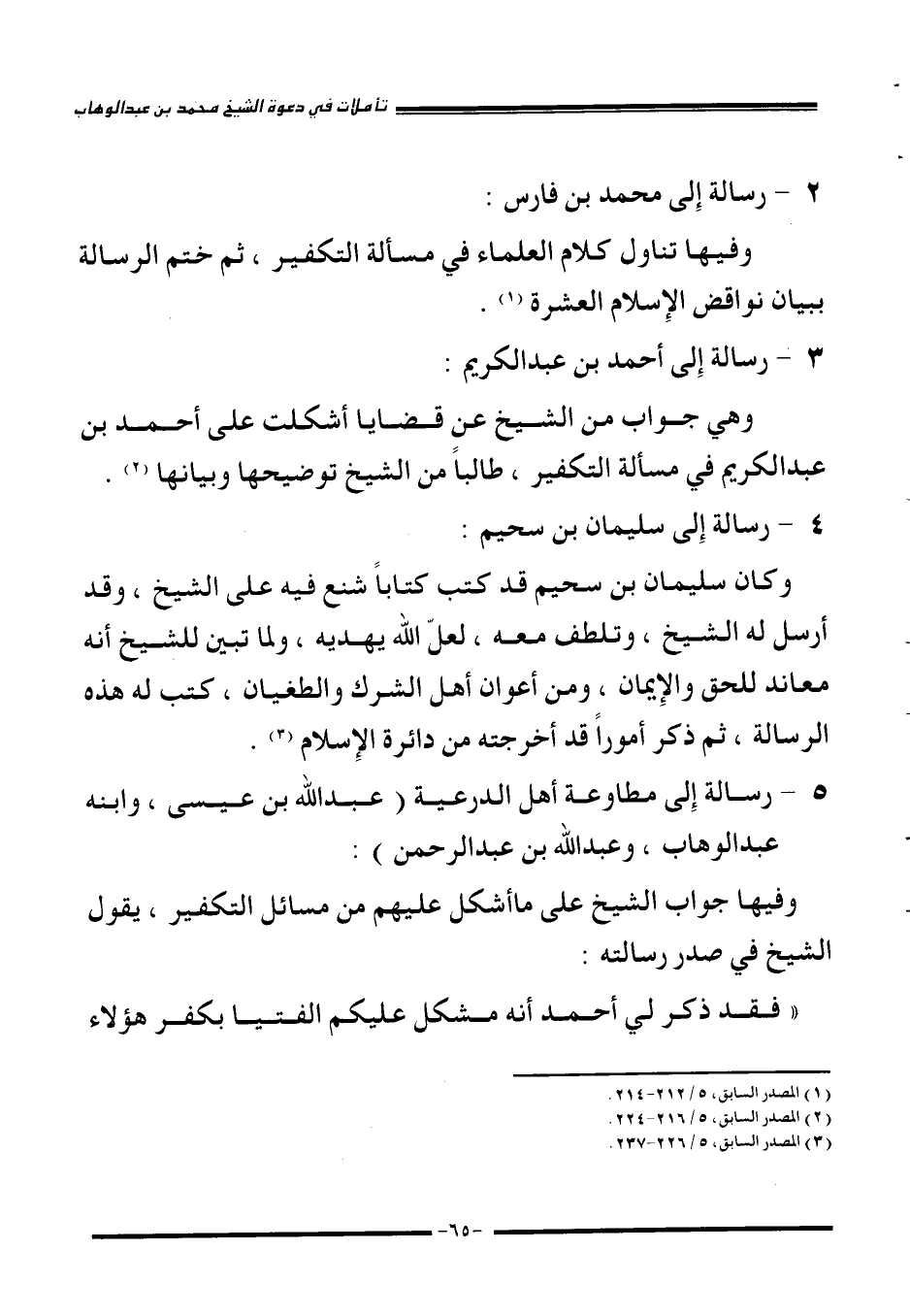 وكان سليمان بن سحيم قد كتب كتابا شنع فيه على الشيخ، وقد أرسل له الشيخ، وتلطف معه، لعل الله يهديه، ولما تبين للشيخ أنه معاند للحق والإيمان، ومن أعوان أهل الشرك والطغيان، كتب له هذه الرسالة، ثم ذكروا أمورا قد أخرجته من دائرة الإسلام3.