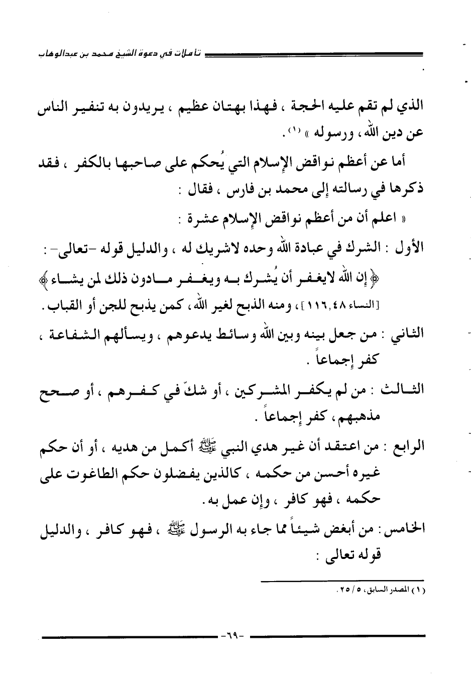 أما عن أعظم نواقض الإِسلام التي يحكم على صاحبها بالكفر، فقد ذكرها في رسالته إِلى محمد بن فارس، فقال: