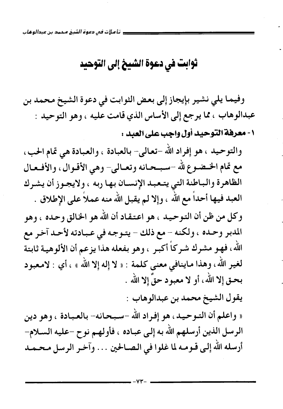 وفيما يلي نشير بإِيجاز إِلى بعض الثوابت في دعوة الشيخ محمد بن عبد الوهاب مما يرجع إلى الأساس الذي قامت عليه، وهو التوحيد: