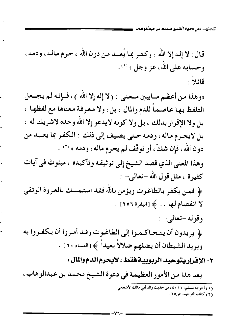 ((وهذا من أعظم ما يبين معنى: (لا إِله إِلا الله) ، فإِنه لم يجعل التلفظ بها عاصما للدم والمال، بل، ولا معرفة معناها مع لفظها، بل ولا الإِقرار بذلك، بل ولا كونه لا يدعو إِلا الله وحده لا شريك له، بل لا يحرم ماله، ودمه حتى يضيف إِلى ذلك: الكفر بما يعبد من دون الله، فإِن شكّ، أو توقف لم يحرم ماله، ودمه)) 2.