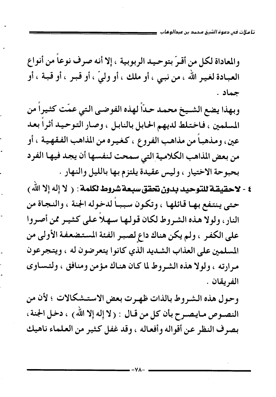 وبهذا يضع الشيخ محمد حدا لهذه الفوضى التي عمت كثيرا من المسلمين، فاختلط لديهم الحابل بالنابل، وصار التوحيد أثرا بعد عين، ومذهبا من مذاهب الفروع، كغيره من المذاهب الفقهية، أو من بعض المذاهب الكلامية التي سمحت لنفسها أن يجد فيها الفرد بحبوحة الاختيار، وليس عقيدة يلتزم بها بالليل والنهار.