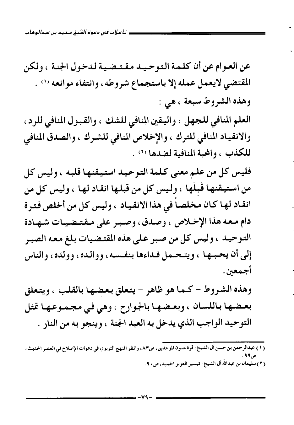 عن العوام عن أن كلمة التوحيد مقتضية لدخول الجنة، ولكن المقتضي لا يعمل عمله إلا باستجماع شروطه، وانتقاء موانعه1. وهذه الشروط سبعة، هي: