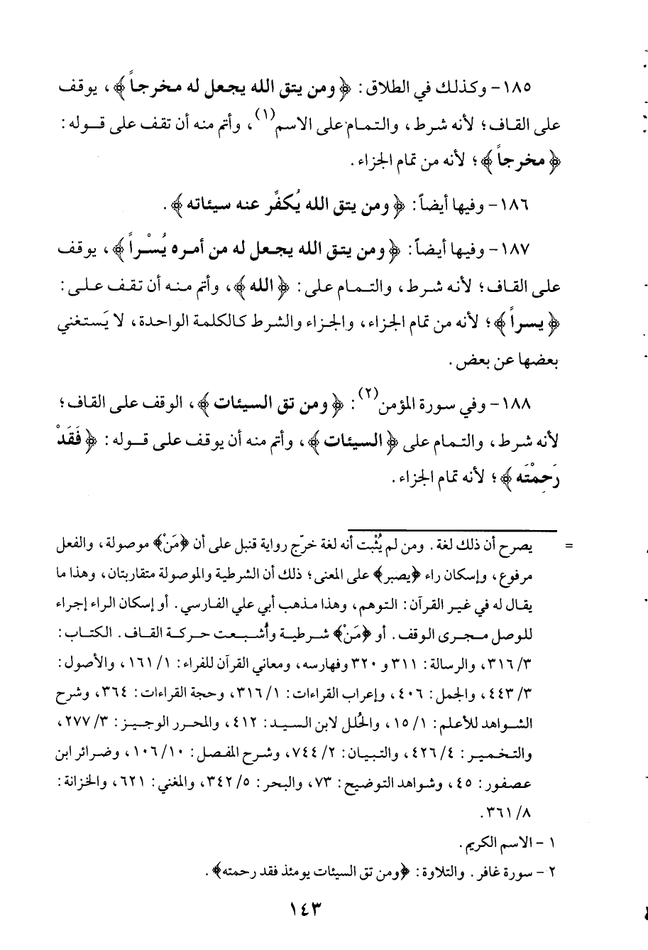 188 - وفي سورة المؤمن: (ومن تق السيئات)، الوقف على القاف؛ لأنه شرط، والتمام على (السيئات)، وأتم منه أن يوقف على قوله: (فقد رحمته (؛ لأنه تمام الجزاء.