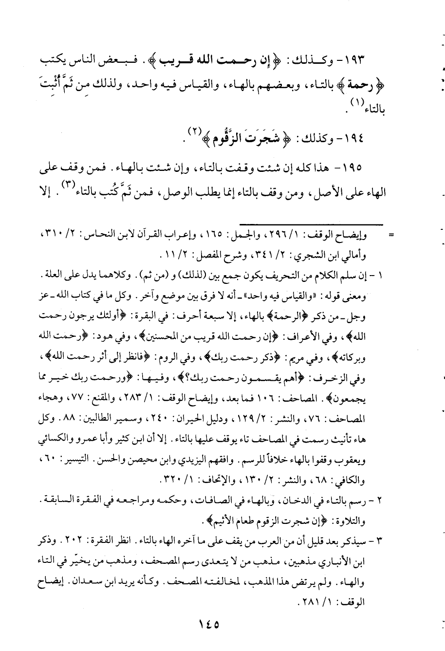 193 - وكذلك: (إن رحمت الله قريب). فبعض الناس يكتب (رحمة) بالتاء، وبعضهم بالهاء، والقياس فيه واحد، ولذلك من ثم أثبتَ بالتاء.