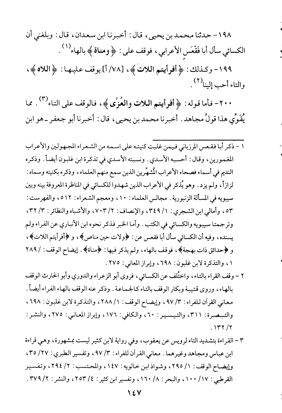 198 - حدثنا محمد بن يحيى، قال: أخبرنا ابن سعدان، قال: وبلغني أن الكسائي سأل أبا فقعس الأعرابي، فوقف على: (ومناة) بالهاء.