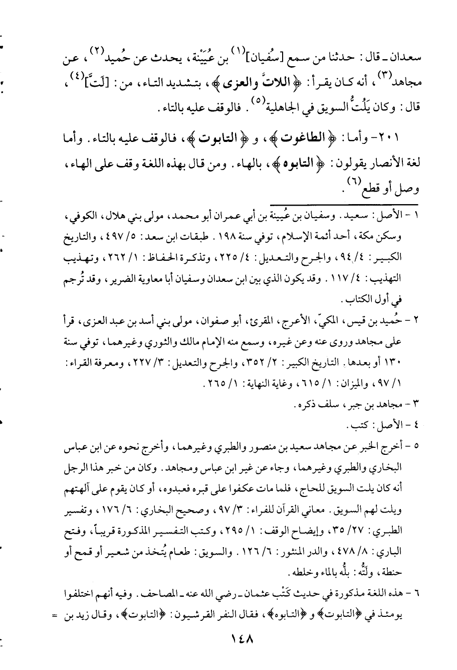 سعدان - قال: حدثنا من سمع [سُفيان] بن عُيينة، يحدث عن حُميد، عن مجاهد، أنه كان يقرأ: (اللات والعزى)، بتشديد التاء، من: [لتَّ]، قال: وكان يلُتُّ السويق في الجاهلية. فالوقف عليه بالتاء.