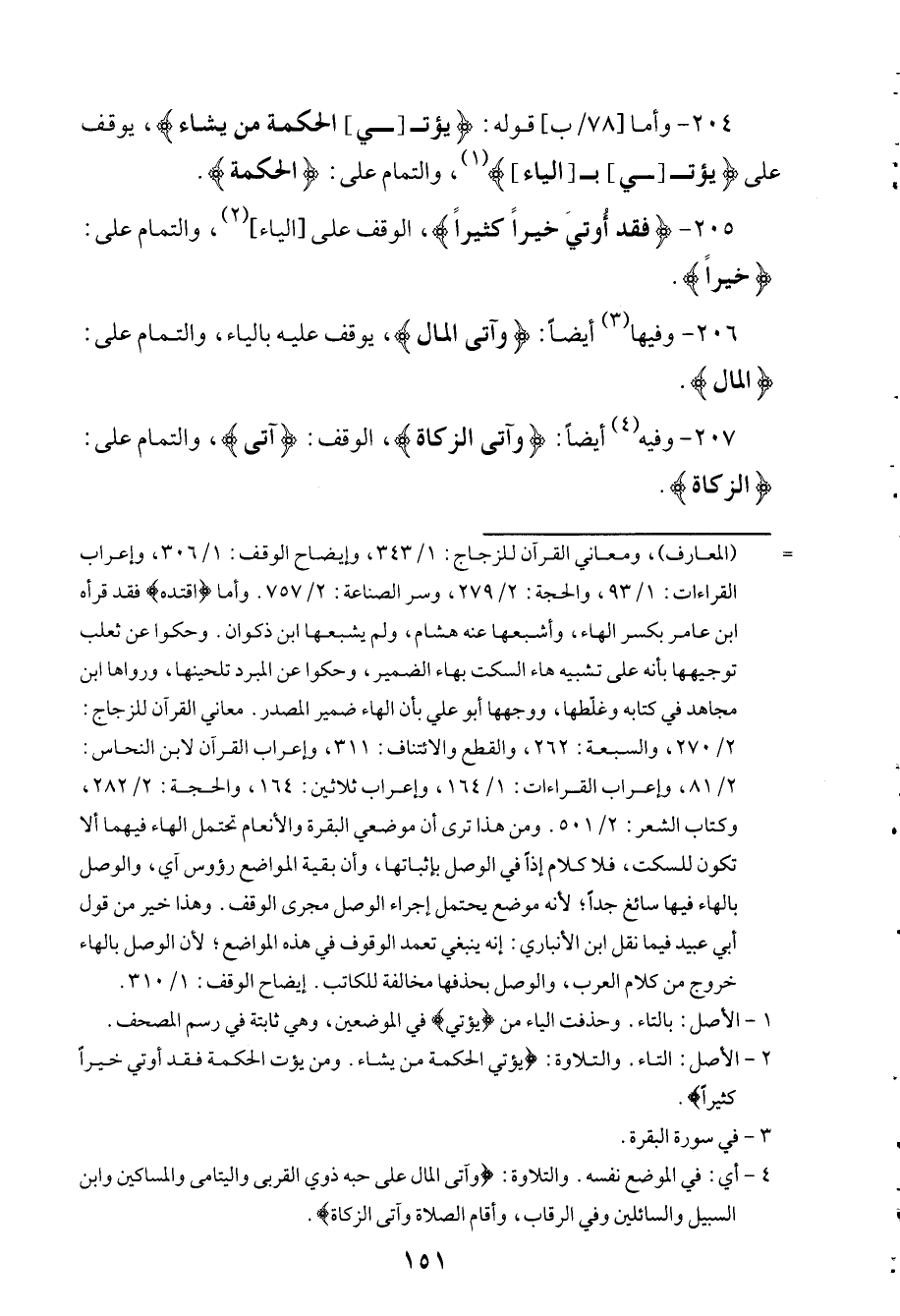 204 - وأما [78/ب] قوله: (يؤتـ[ـي] الحكمة من يشاء)، يوقف على (يؤتـ[ـي] بـ[الياء])، والتمام على: (الحكمة).