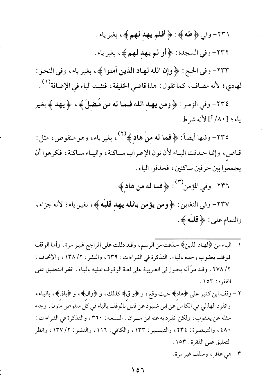 235 - وفيها أيضاً: (فما له من هاد)، بغير ياء، وهو منقوص، مثل: قاضٍ، وإنما حذفت الياء لأن نون الإعراب ساكنة، والياء ساكنة، فكرهوا أن يجمعوا بين حرفين ساكنين، فحذفوا الياء.
