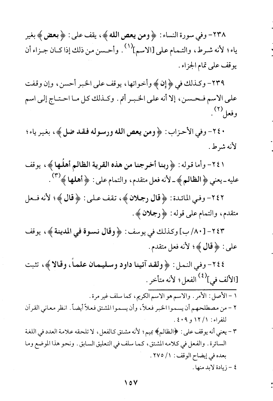238 - وفي سورة النساء: (ومن يعص الله)، يقف على: (بعض) بغير ياء؛ لأنه شرط، والتمام على [الاسم]. وأحسن من ذلك إذا كان جزاء أن يوقف على تمام الجزاء.
