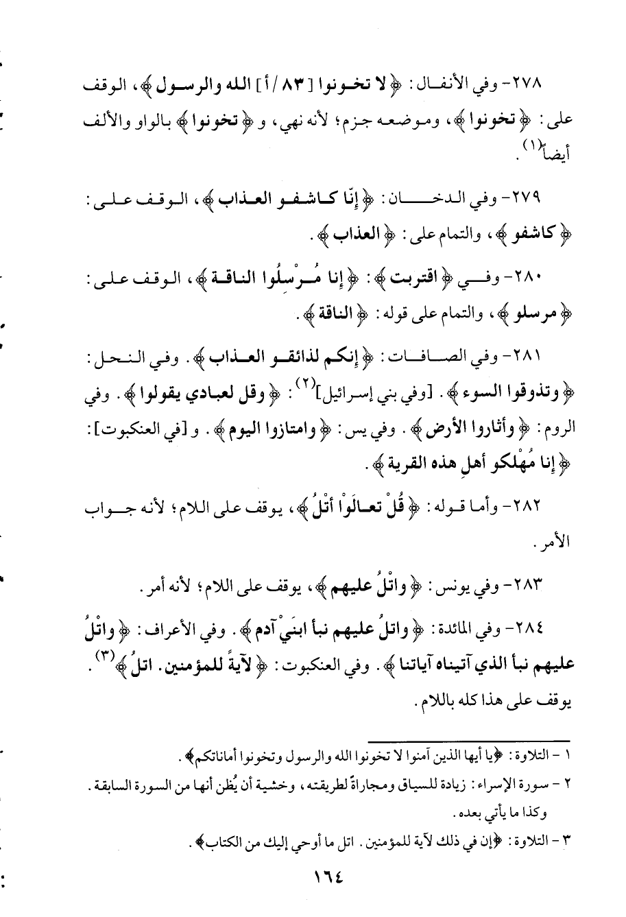 284 - وفي المائدة: (واتلُ عليهم نبأ ابني آدم). وفي الأعراف: (واتلُ عليهم نبأ الذي آتيناه آياتنا). وفي العنكبوت: (لآية للمؤمنين. اتلُ). يوقف على هذا كله باللام.