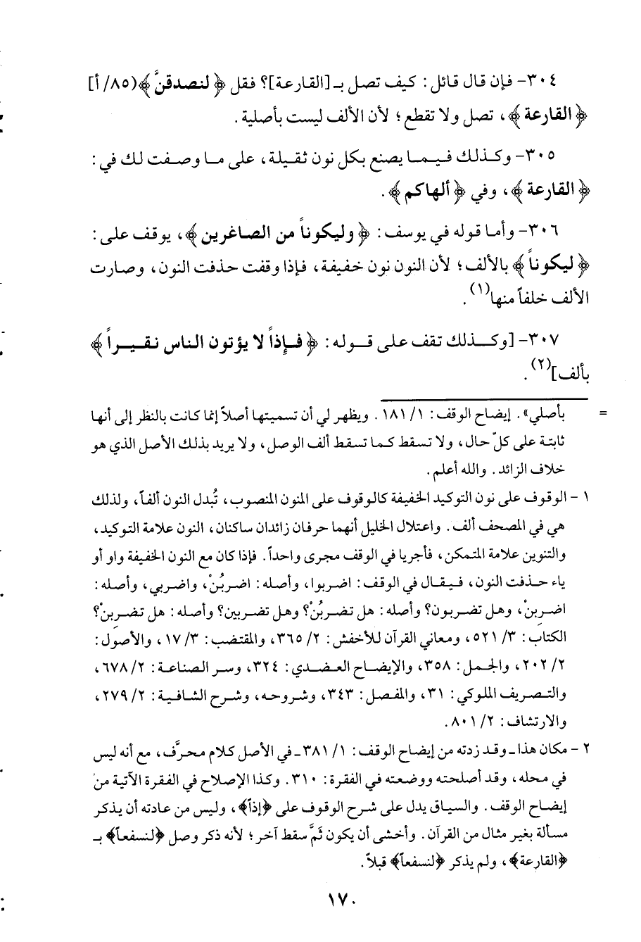 306 - وأما قوله في يوسف: (وليكوناً من الصاغرين)، يوقف على: (ليكوناً) بالألف؛ لأن لانون نون خفيفة، فإذا وقفت حذفت النون، وصارت الألف خلفاً منها.