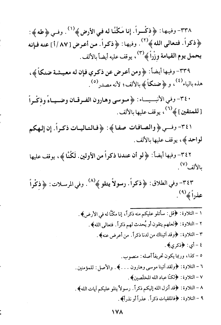 338 - وفيها: (ذكراً. إنا مكنا له في الأرض). وفي (طه): (ذكراً. فتعالى الله). وفيها: (ذكراً. من أعرض [87/أ] عنه فإنه يحمل يوم القيامة وزراً)، يوقف عليه أيضاً بالألف.
