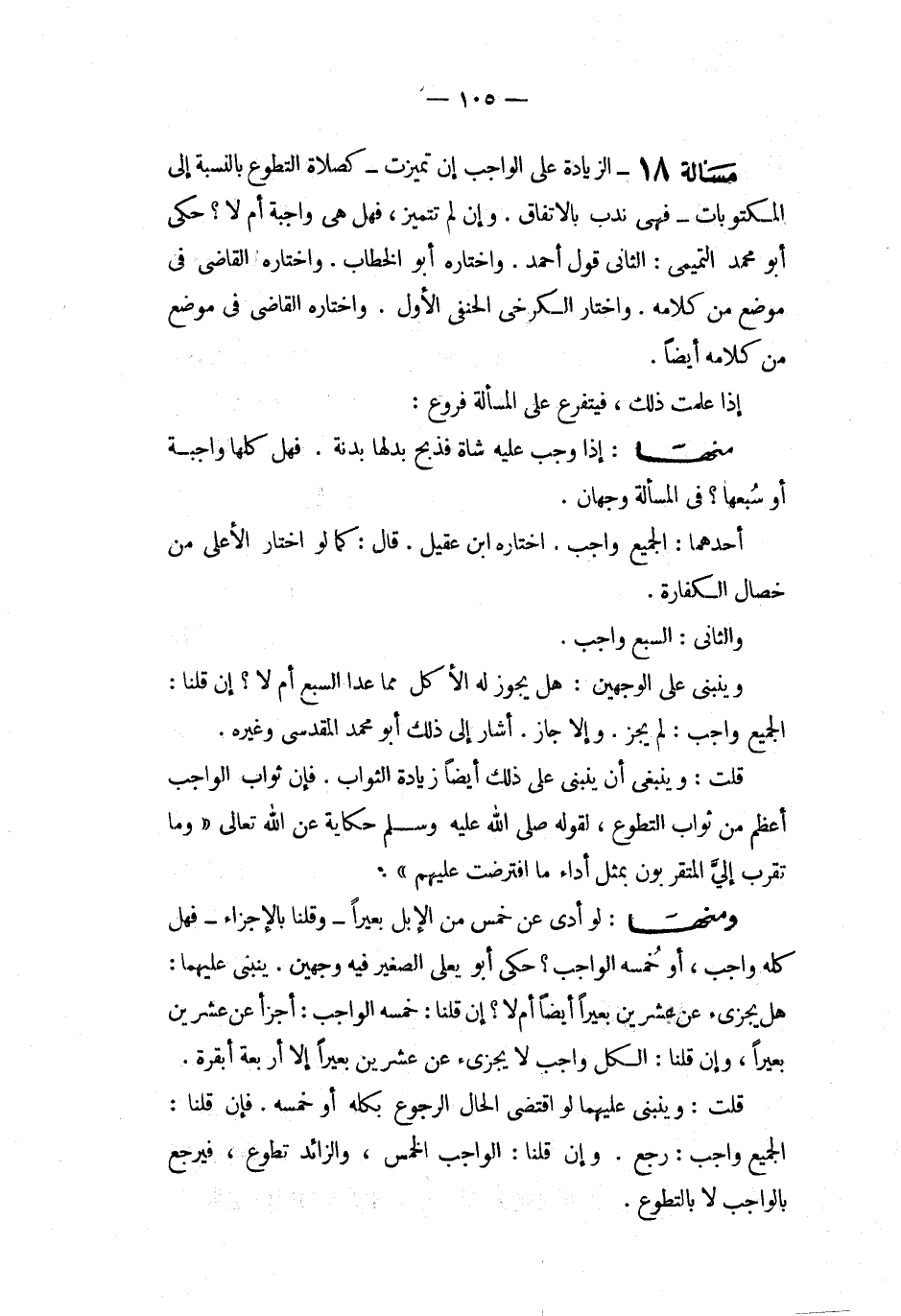 مسألة 18 الزيادة على الواجب إن تميزت كصلاة التطوع بالنسبة إلى المكتوبات فهى ندب بالاتفاق وإن لم تتميز فهل هى واجبة أم لا؟ حكى أبو محمد التميمى الثانى قول أحمد واختاره أبو الخطاب واختاره القاضى فى موضع من كلامه واختار الكرخى الحنفى الأول واختاره القاضى فى موضع من كلامه أيضا