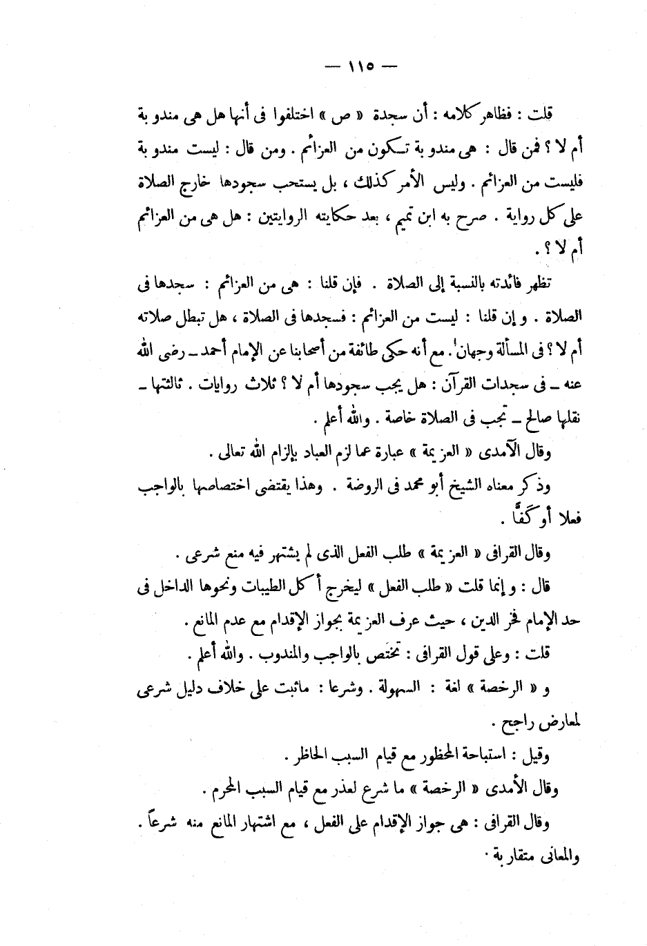 قلت فظاهر كلامه أن سجدة ص اختلفوا فى أنها هل هى مندوبة أم لا فمن قال هى مندوبة تكون من العزائم ومن قال ليست مندوبة فليست من العزائم وليس الأمر كذلك بل يستحب سجودها خارج الصلاة على كل رواية صرح به ابن تميم بعد حكايته الروايتين هل هى من العزائم أم لا