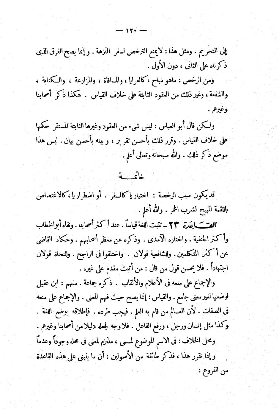 القاعدة 23 تثبت اللغة قياسا عند أكثر أصحابهم ونفاه أبو الخطاب وأكثر الحنفية واختاره الآمدى وذكره عن معظم أصحابنا وحكاه القاضى عن أكثر المتكلمين وللشافعية قولان واختلفوا فى الراجح وللنحاة قولان اجتهادا فلا يحسن قول من قال من أثبت مقدم على غيره