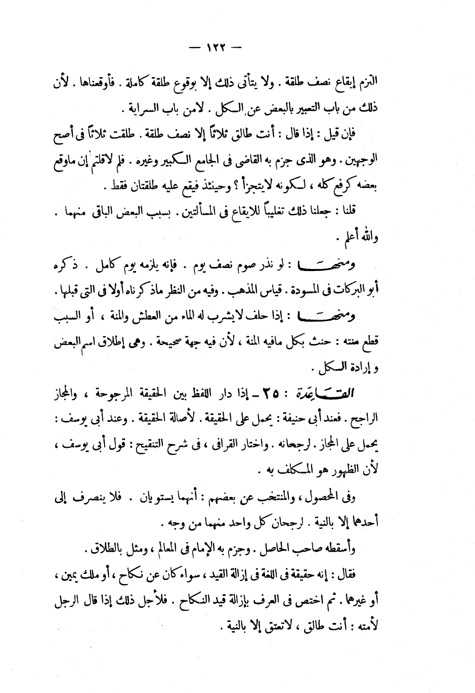 القاعدة 25 إذا دار اللفظ بين الحقيقة المرجوحة والمجاز الراجح فعند أبى حنيفة يحمل على الحقيقة لأصالة الحقيقة وعند أبى يوسف يحمل على المجاز لرجحانه واختار القرافى فى شرح التنقيح قول أبى يوسف لأن الظهور هو المكلف به