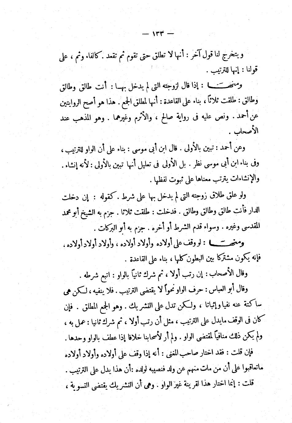 ومنها إذا قال لزوجته التى لم يدخل بها أنت طالق وطالق وطالق طلقت ثلاثا بناء على القاعدة أنها لمطلق الجمع هذا هو أصح الروايتين عن أحمد ونص عليه فى رواية صالح والأثرم وغيرهما وهو المذهب عند الأصحاب