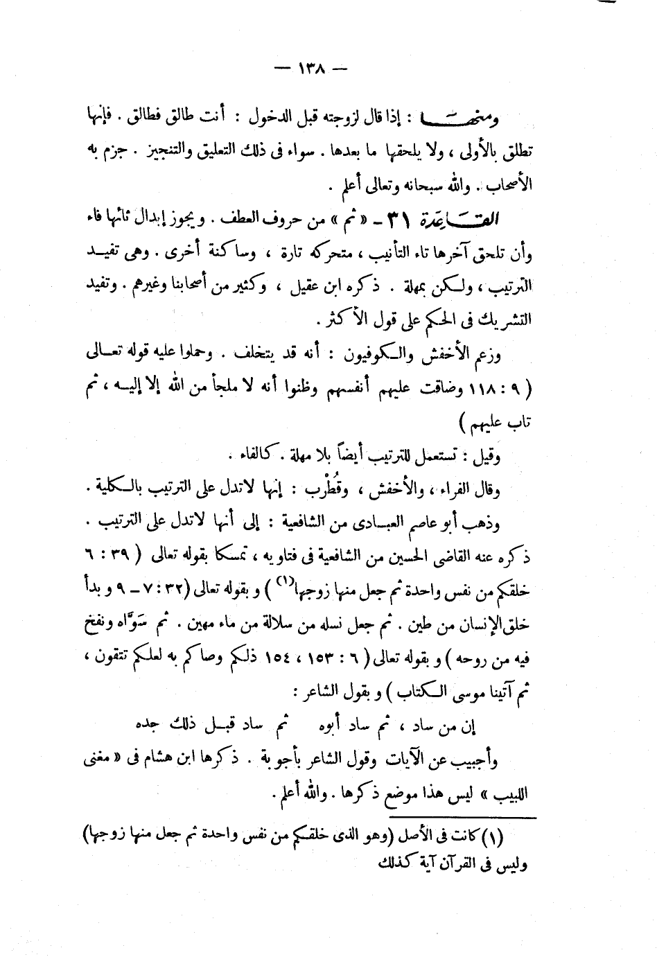 القاعدة 31 ثم من حروف العطف ويجوز إبدال ثائها فاء وأن تلحق آخرها تاء التأنيب متحركة تارة وساكنة إخرى وهى تفيد الترتيب ولكن بمهلة ذكره ابن عقيل وكثير من أصحابنا وغيرهم وتفيد التشريك فى الحكم على قول الأكثر