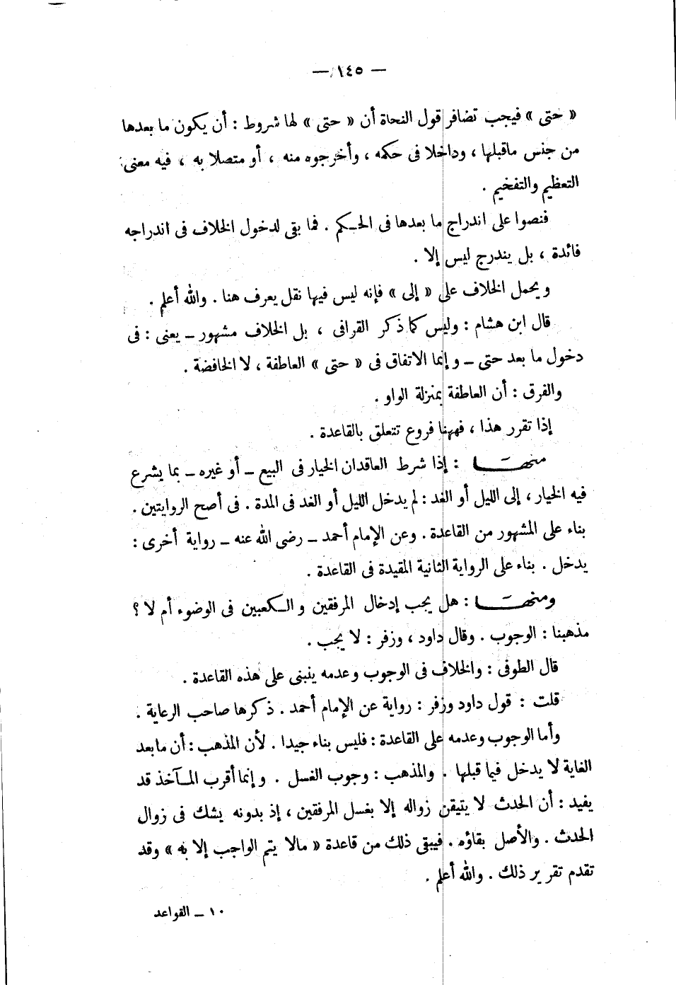 وأما الوجوب وعدمه على القاعدة فليس بناء جيدا لأن المذهب أن ما بعد الغاية لا يدخل فيما قبلها والمذهب وجوب الغسل وإنما أقرب المآخذ قد يفيد أن الحدث لا يتيقن زواله إلا بغسل المرفقين إذ بدونه يشك فى زوال الحدث والأصل بقاؤه فيبقى ذلك من قاعدة ما لا يتم الواجب إلا به وقد تقدم تقرير ذلك والله أعلم