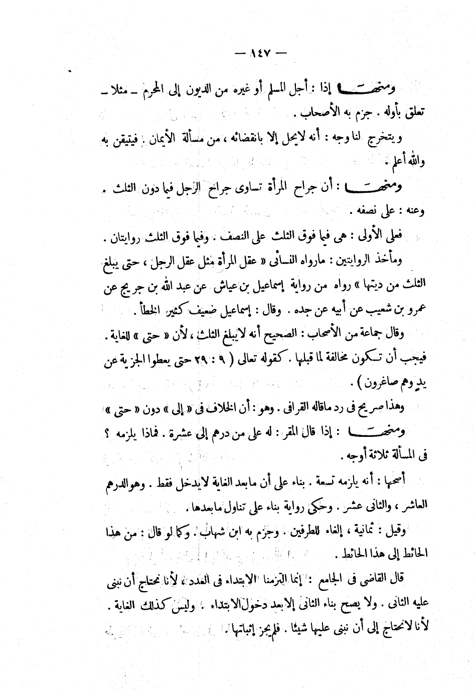 ومنها أن جراح المرأة تساوى جراح الرجل فيما دون الثلث وعنه على نصفه