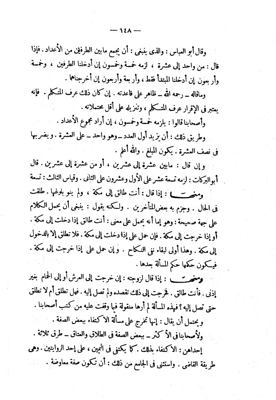 وقال أبو العباس والذى ينبغى أن يجمع ما بين الطرفين من الأعداد فإذا قال من واحد إلى عشرة لزمه خمسة وخمسون إن أدخلنا الطرفين وخمسة وأربعون إن أدخلنا المبتدأ فقط وأربعة وأربعون إن أخرجناهما