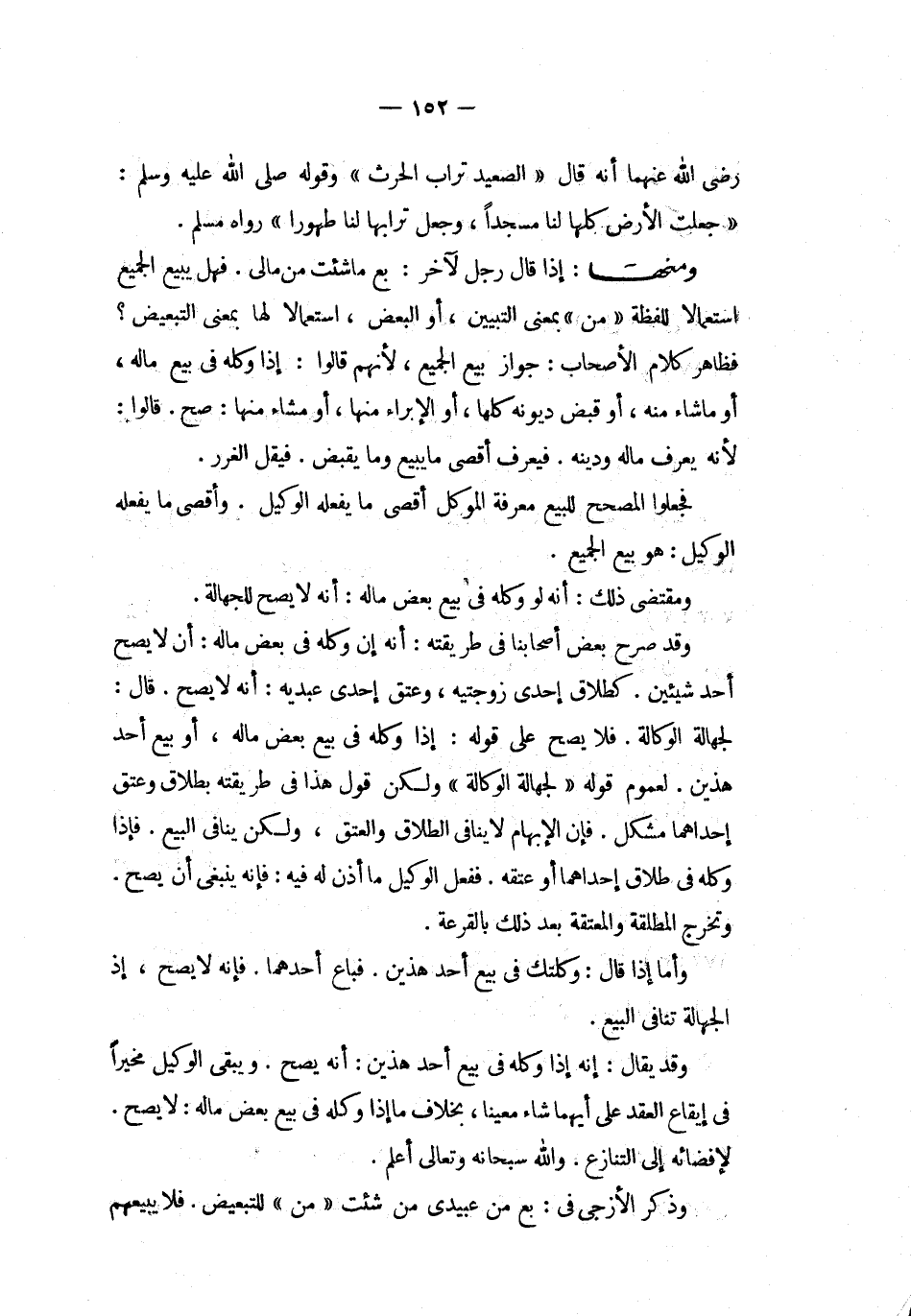 ومنها إذا قال رجل لآخر بع ما شئت من مالى فهل يبيع الجميع استعمالا للفظة من بمعنى التبيين أو البعض استعمالا لها بمعنى التبعيض فظاهر كلام الأصحاب جواز بيع الجميع لأنهم قالوا إذا وكله فى بيع ماله أو ما شاء منه أو قبض ديونه كلها أو الإبراء منها أو مشاء منها صح قالوا لأنه يعرف ماله ودينه فيعرف أقصى ما يبيع وما يقبض فيقل الغرر