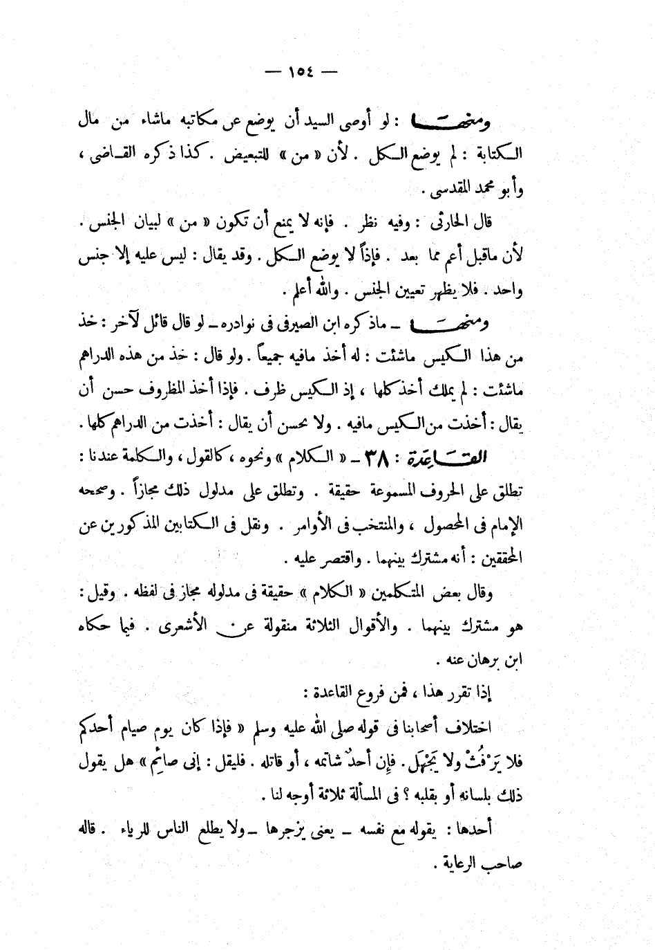 القاعدة 38 الكلام ونحوه كالقول والكلمة عندنا تطلق على الحروف المسموعة حقيقة وتطلق على مدلول ذلك مجازا وصححه الإمام فى المحصول والمنتخب فى الأوامر ونقل فى الكتابين المذكورين عن المحققين أنه مشترك بينهما واقتصر عليه
