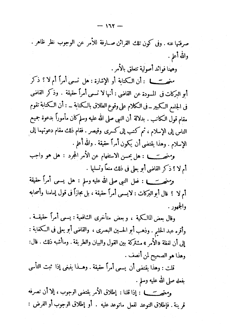 منها أن الكتابة أو الإشارة هل تسمى أمرا أم لا ذكر أبو البركات فى المسودة عن القاضى أنها لا تسمى أمرا حقيقة وذكر القاضى فى الجامع الكبير فى الكلام على وقوع الطلاق بالكتابة أن الكتابة تقوم مقام قول الكاتب بدلالة أن النبي صلى الله عليه و سلم كان مأمورا بدعوة جميع الناس إلى الإسلام ثم كتب إلى كسرى وقيصر فقام ذلك مقام دعوتهما إلى الإسلام وهذا يقتضى أن يكون أمرا حقيقة والله أعلم