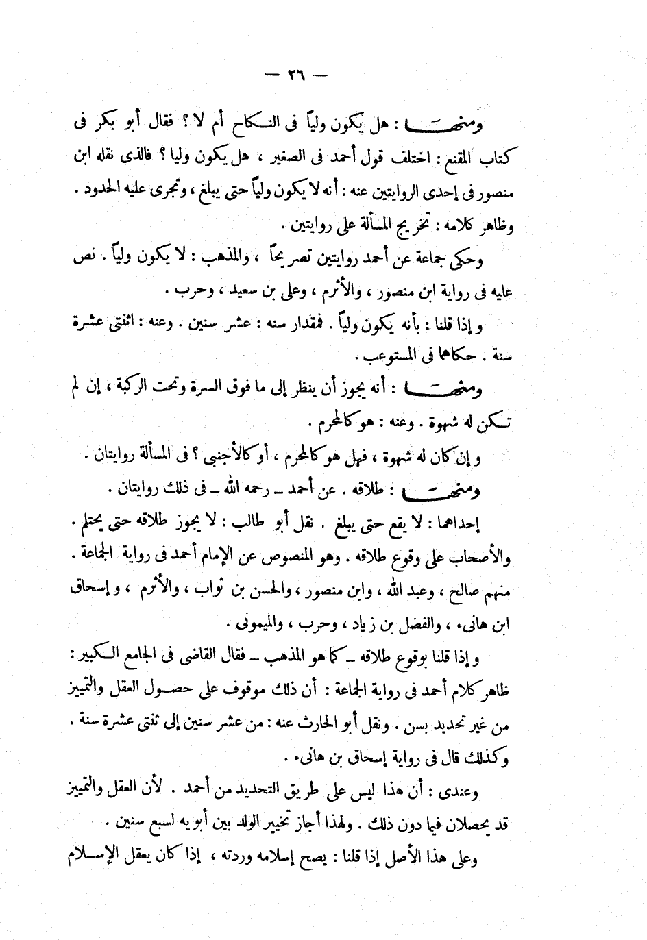 ومنها هل يكون وليا في النكاح أم لا فقال أبو بكر فى كتاب المقنع اختلف قول أحمد في الصغير هل يكون وليا فالذى نقله ابن منصور فى إحدى الروايتين عنه أنه لا يكون وليا حتى يبلغ وتجري عليه الحدود وظاهر كلامه تخريج المسألة على روايتين