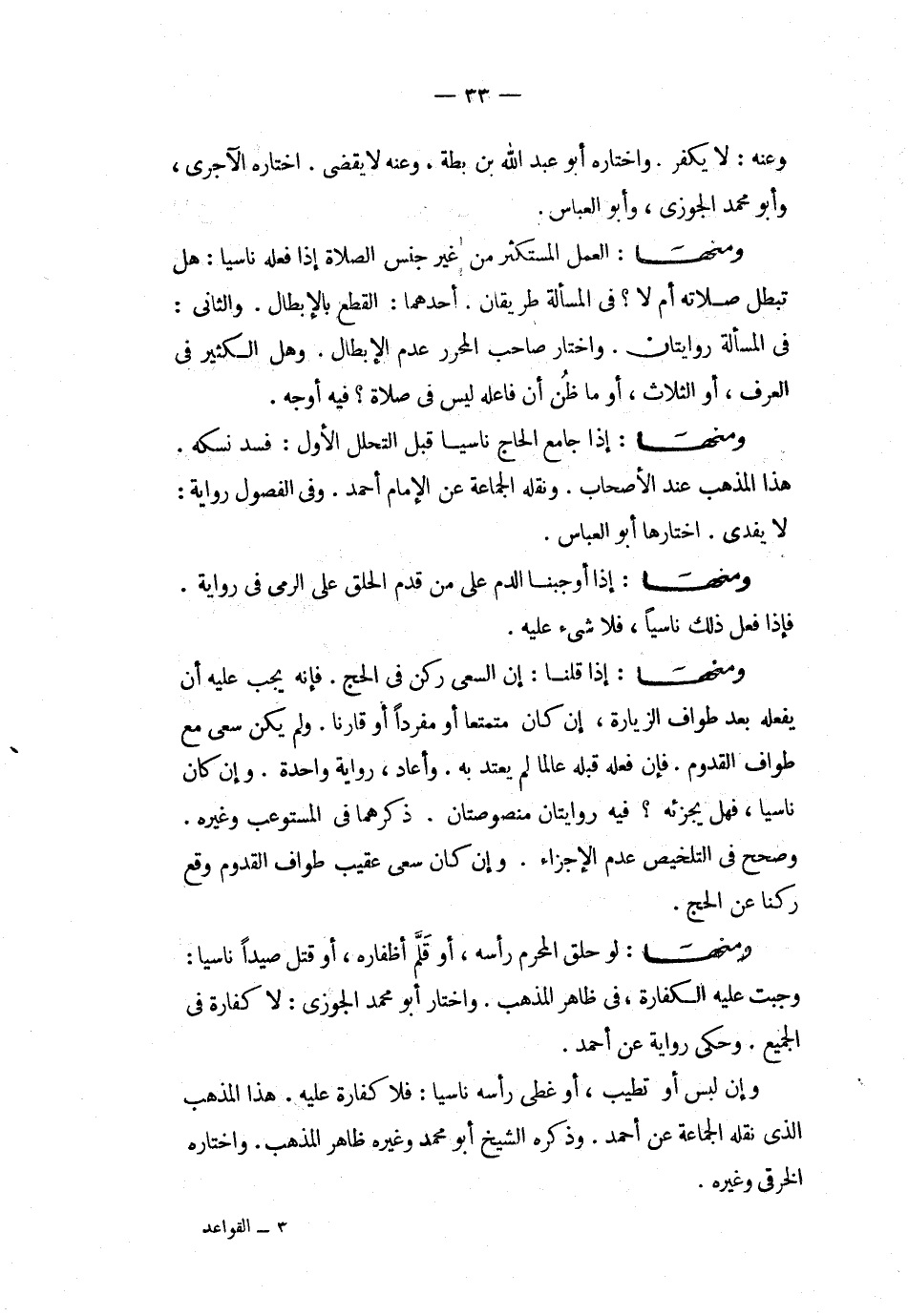 ومنها لو حلق المحرم رأسه أو قلم أظفاره أو قتل صيدا ناسيا وجبت عليه الكفارة فى ظاهر المذهب واختار أبو محمد الجوزى لا كفارة فى الجميع وحكى رواية عن أحمد